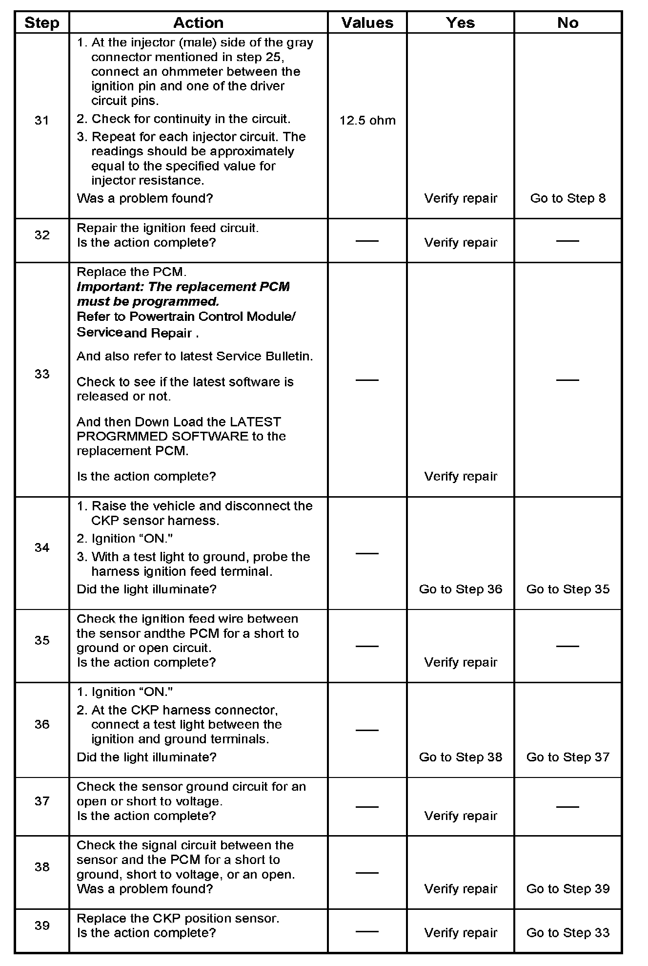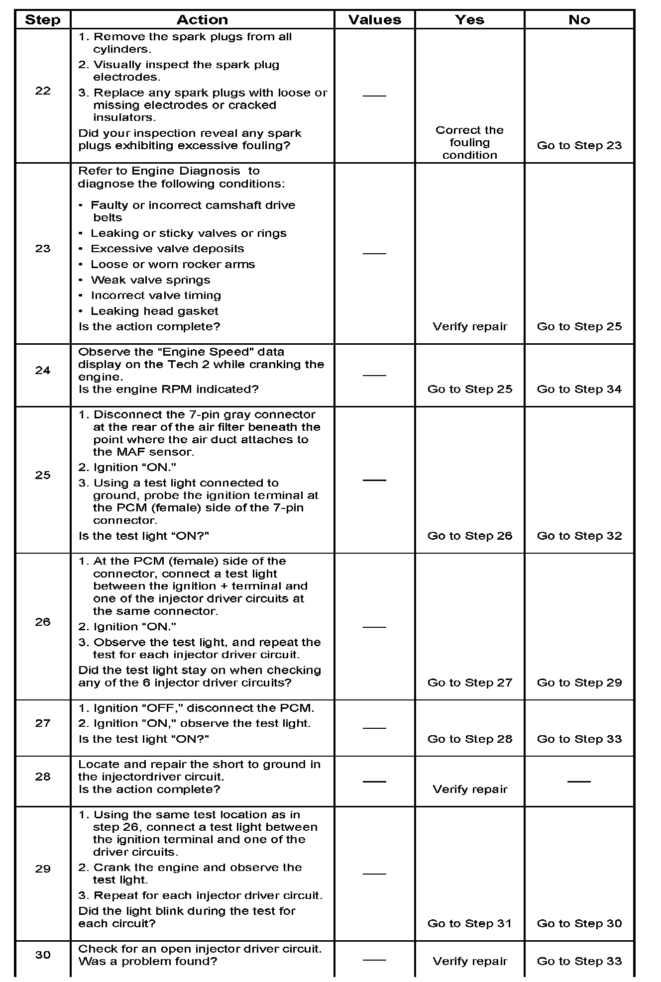 This procedure only tests the driver circuit as far as the test connection, so step 31 is added to test the circuit all the way to the injector.