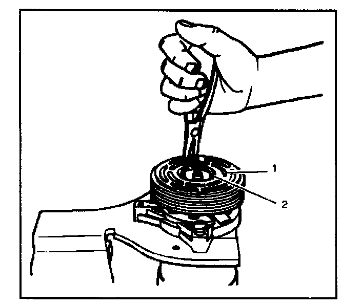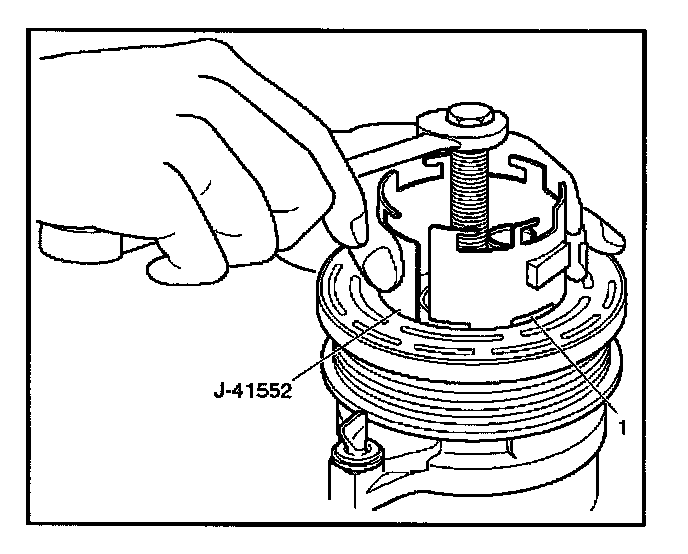 3. Install pulley rotor and bearing puller guide J-33023-A to the front head and install J-41552 pulley rotor and bearing puller down into the inner circle of slots (1) in the rotor. Turn the J41552 puller clockwise in the slots in the rotor.