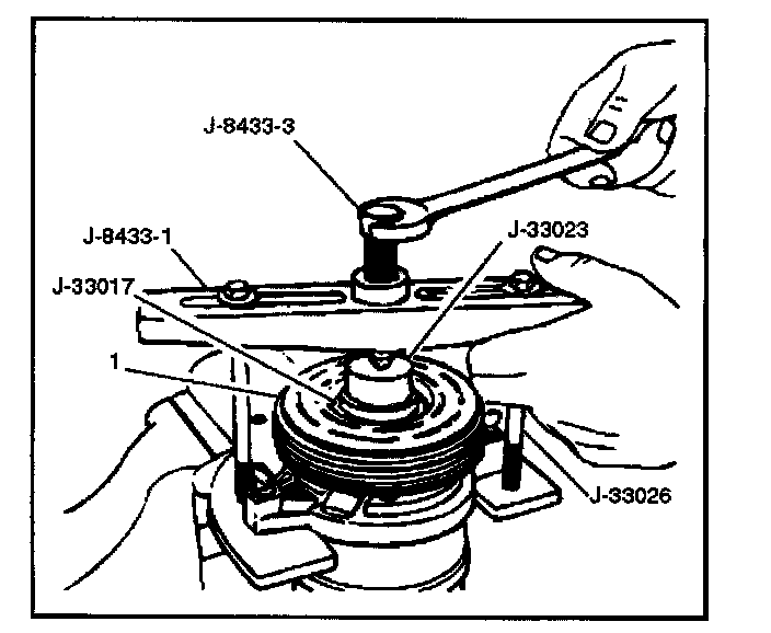 4. Tighten the center screw in the J-8433-1 puller crossbar to force the pulley rotor (1) and bearing assembly onto the compressor front head. Should the J-33017 pulley rotor and bearing installer slip off direct in-line contact with the inner race of the bearing, loosen the J-8433-1 center forcing screw and realign the installer and pilot so that the J-33017 installer will properly clear the front head.