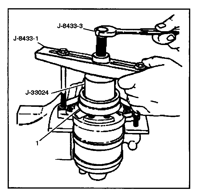 4. Turn the center forcing screw of J-8433-1 puller crossbar to force the clutch coil onto the front head. Be sure clutch coil and J-33024 installer stay "in-line" during installation.