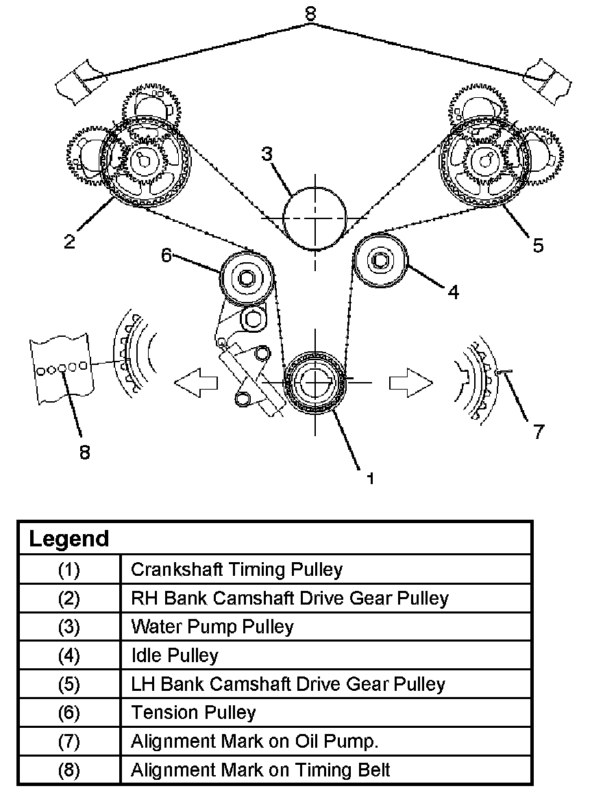 e. Install crankshaft pulley temporarily and tighten center bolt by hand (do not use a wrench). Turn the crankshaft pulley clockwise to give some belt slack between the crankshaft timing pulley and the RH bank camshaft drive gear pulley.