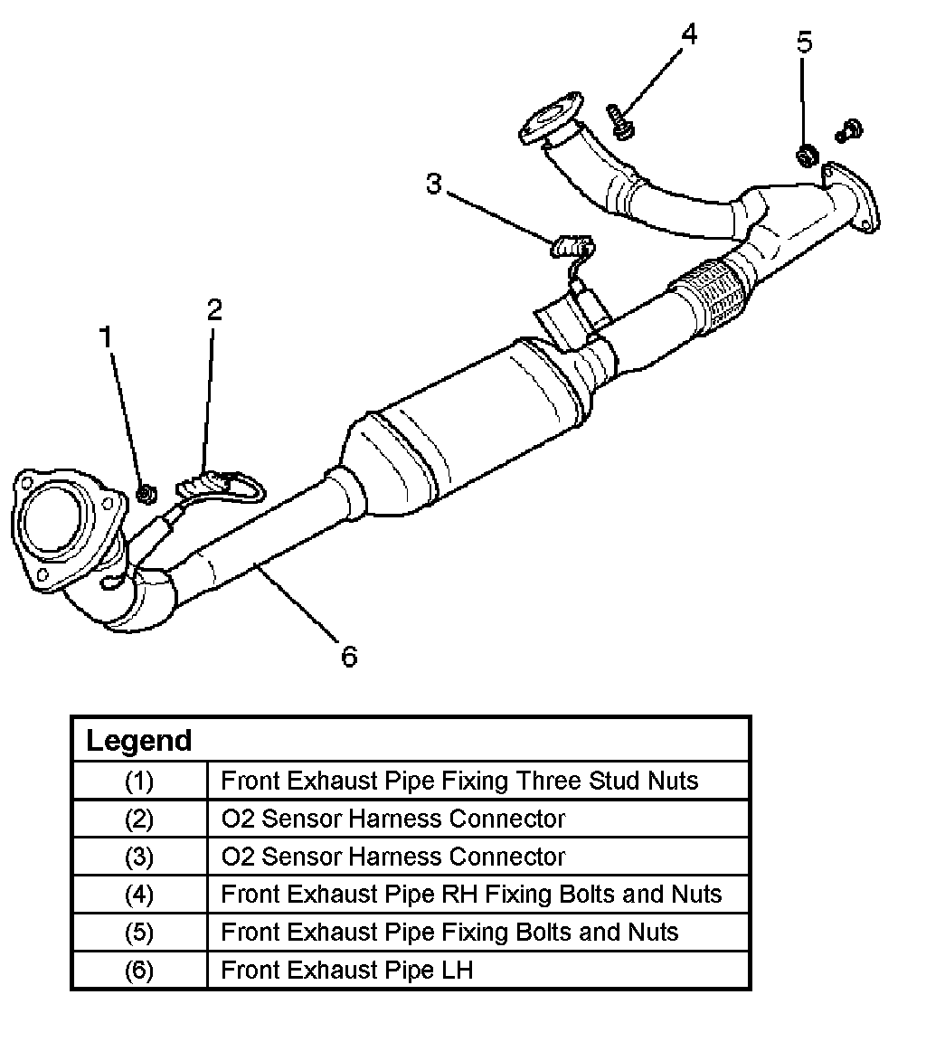 1. Install exhaust front pipe (6) and tighten three studs nuts (1) and two nuts (4)(5) to the specified torque.