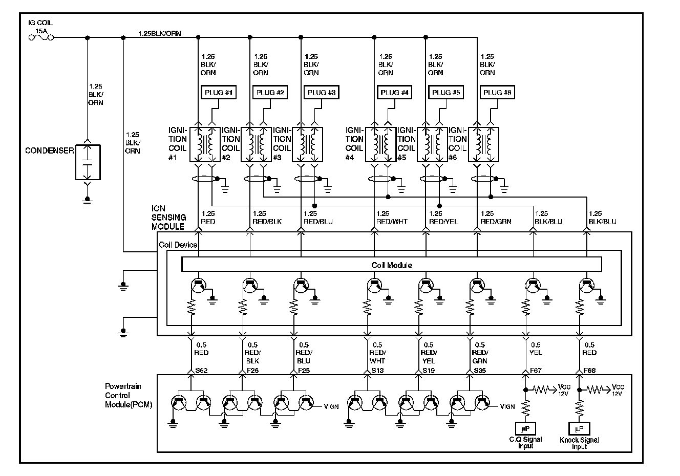 The electronic Ignition system uses a coil -at-plug method of spark distribution. In this type of ignition system, the powertrain control module (PCM) triggers the correct driver outside the Ignition Current Sense System (ICSS), which then triggers the correct ignition coil based on the 58X signal received from the crankshaft position sensor (CKP). The spark plug connected to the coil fires when the ICSS opens the ground circuit for the coil's primary circuit.