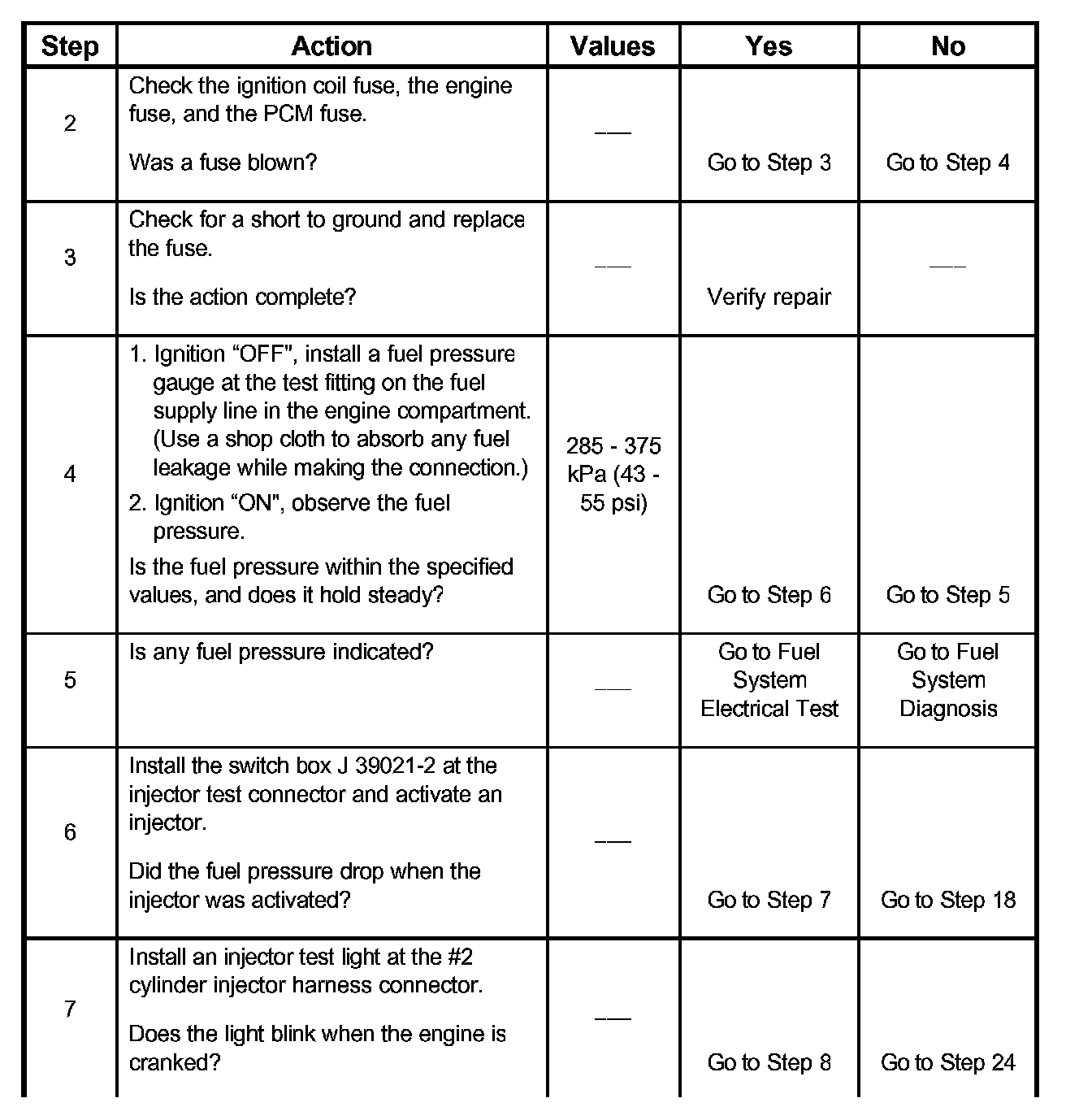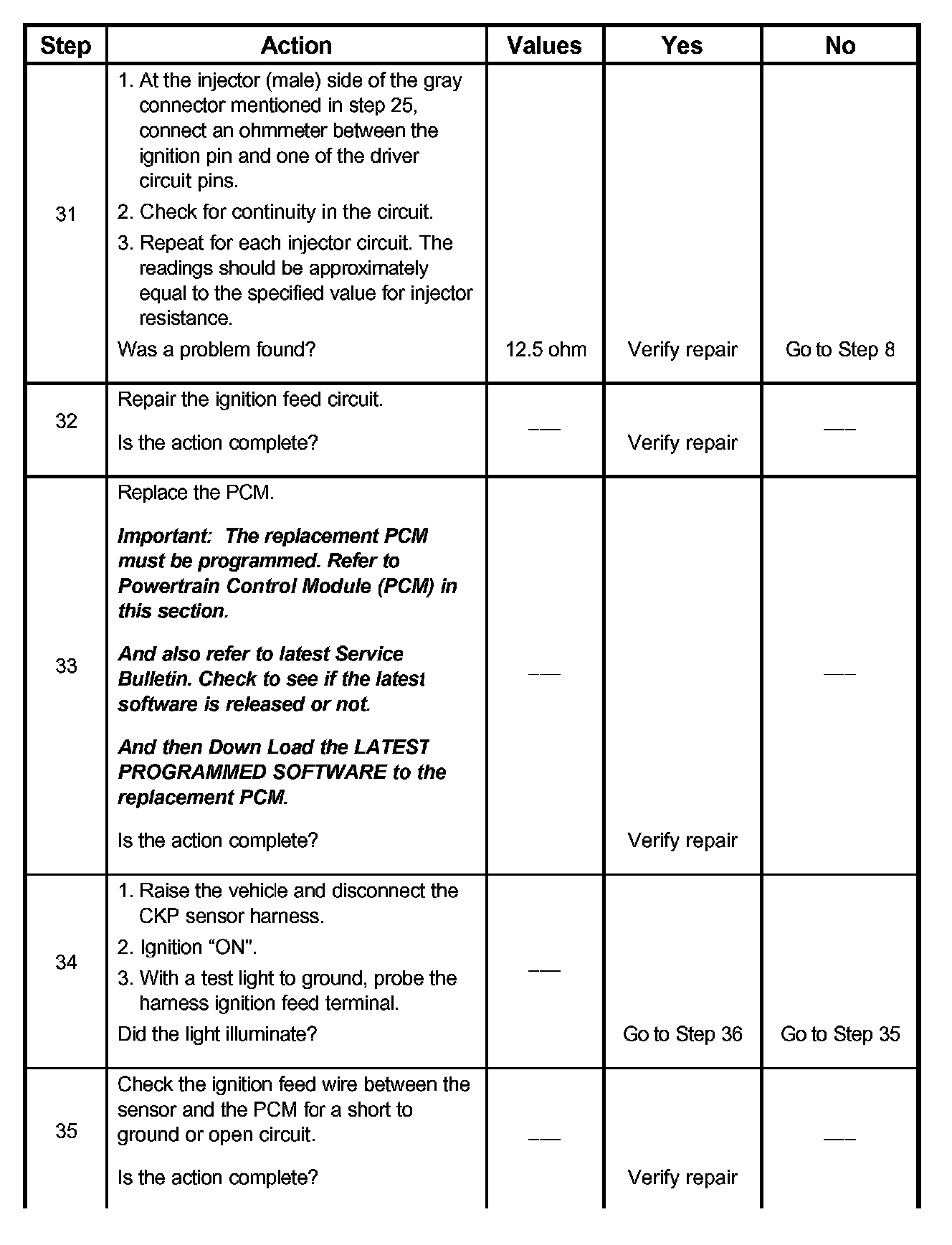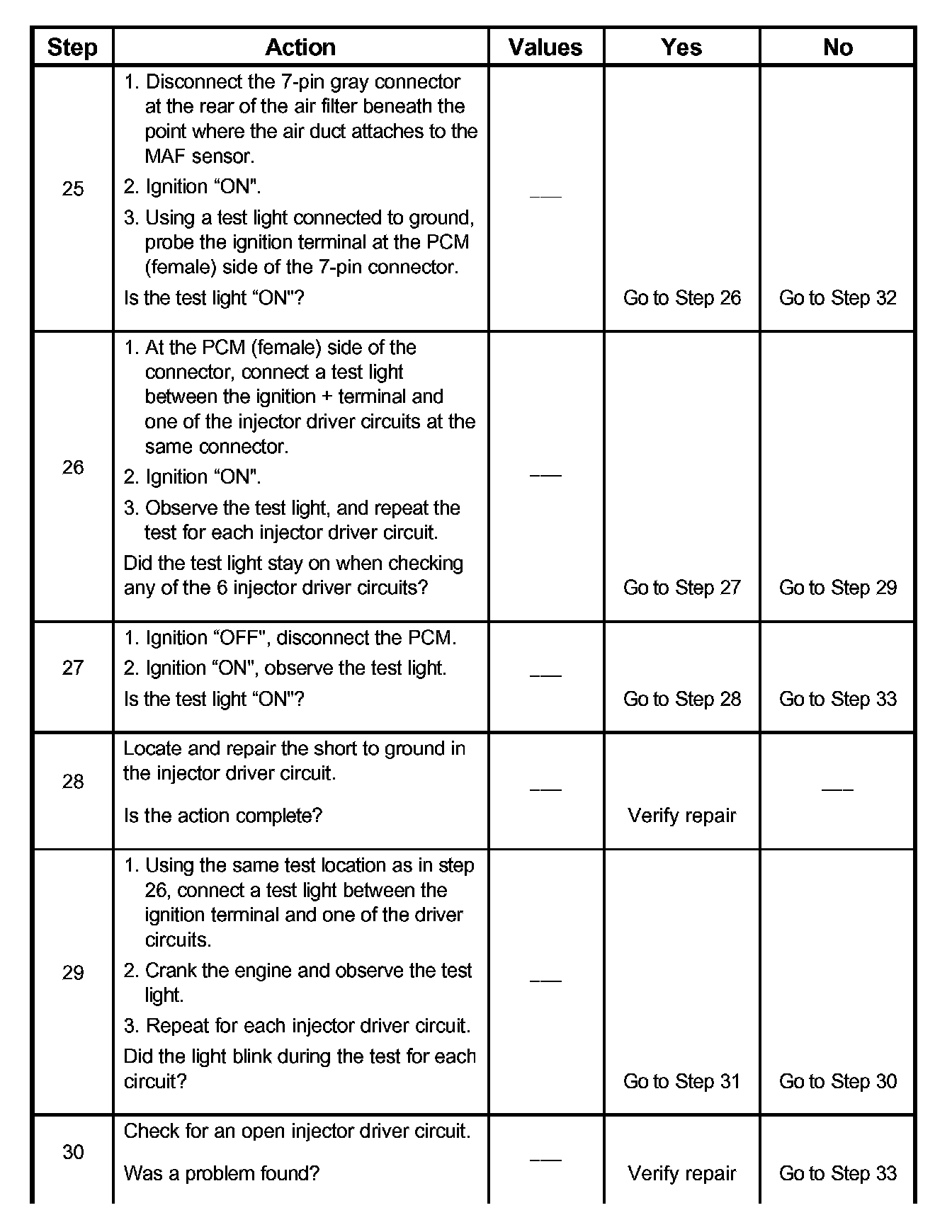 This procedure only tests the driver circuit as far as the test connection, so step 31 is added to test the circuit all the way to the injector.