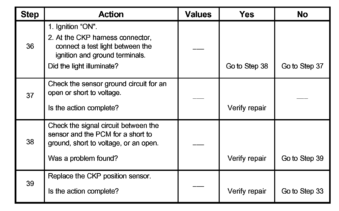 7. A blinking test light verifies that the PCM is monitoring the 58X crankshaft reference signal and is capable of activating the injectors. If there is an open or shorted driver circuit, DTCs 201 - 206 and a misfire DTC 300 - 306 should be set.
