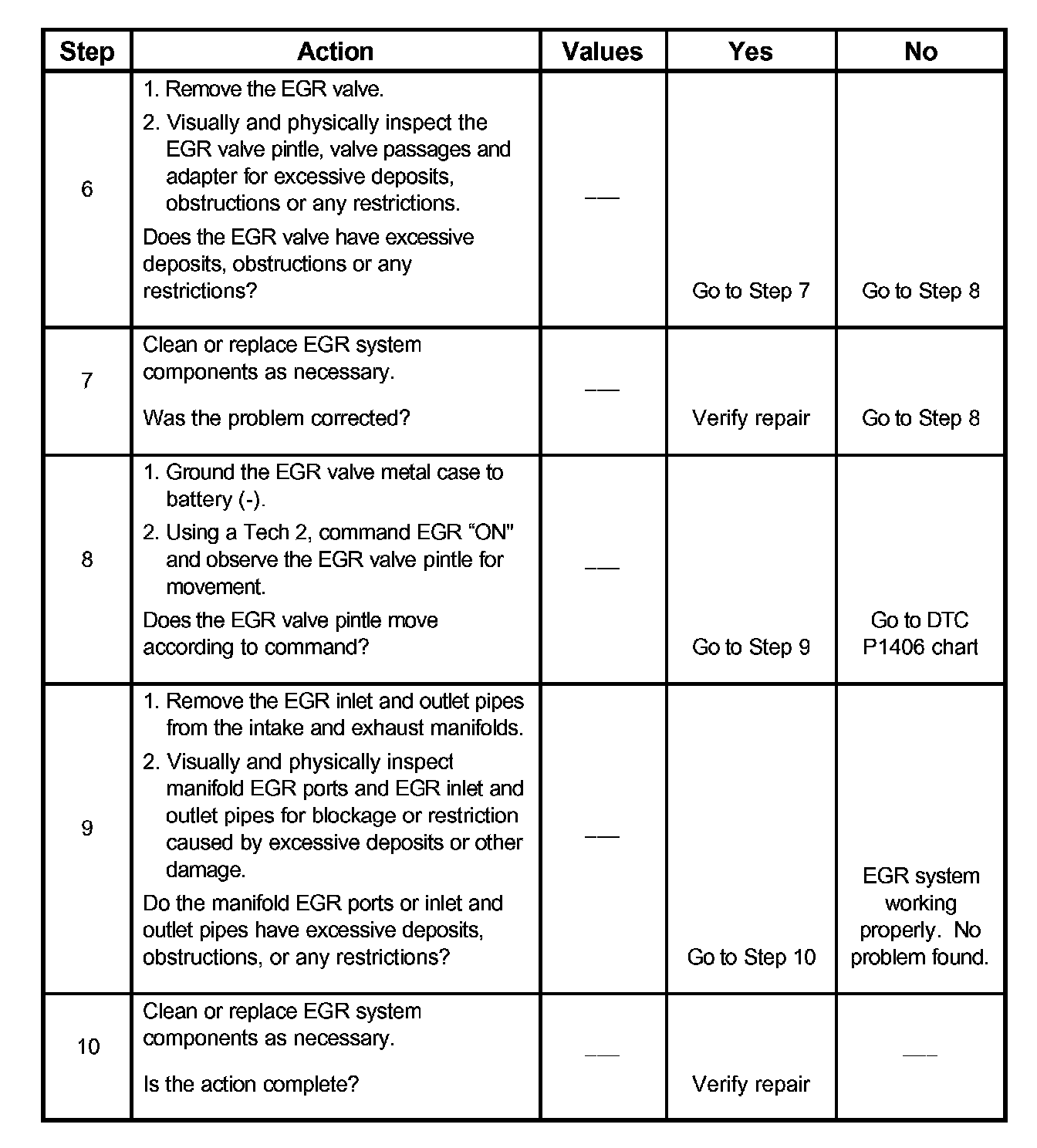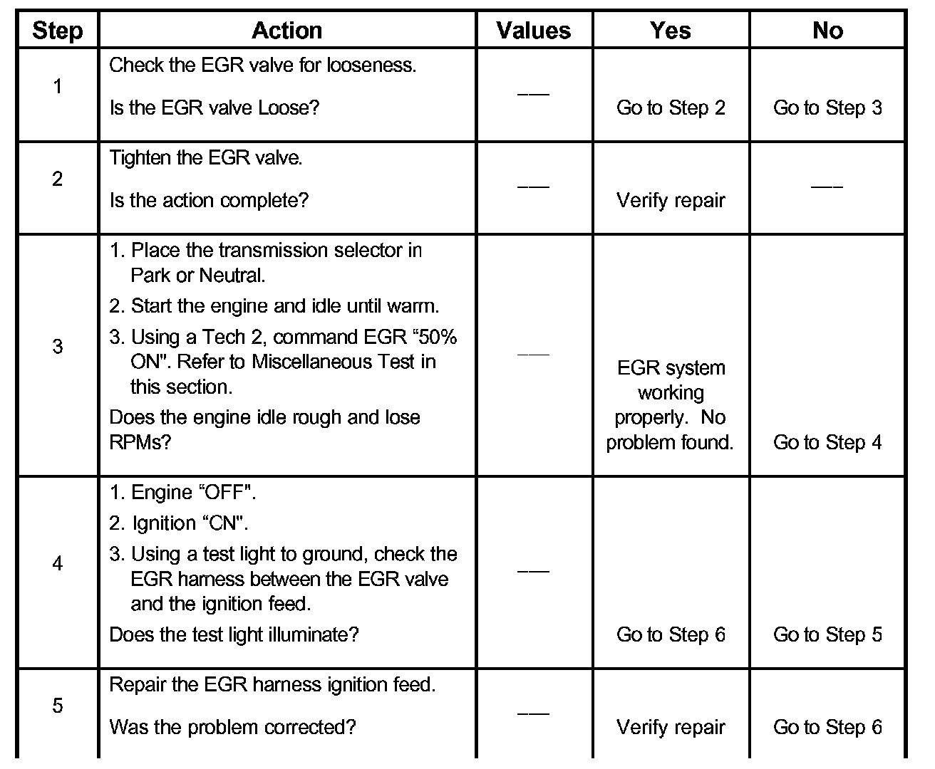 The EGR valve chart is a check of the EGR system. An EGR pintle constantly in the closed position could cause detonation and high emissions of NOx. It could also result in high long term fuel trim values in the open throttle cell, but not in the closed throttle cell. An EGR pintle constantly in the open position would cause a rough idle. Also, an EGR mounted incorrectly (rotated 180 ) could cause rough idle. Check for the following items: