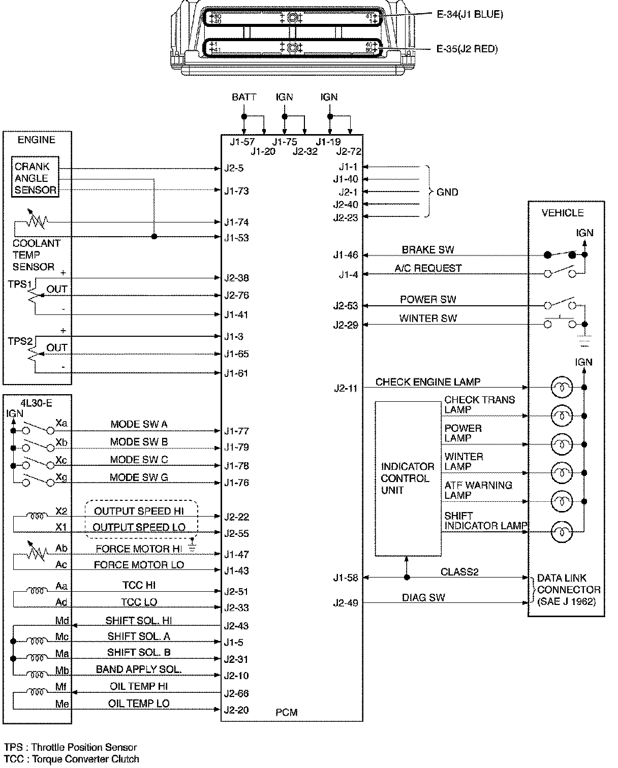 General DescriptionThe 4L30-E is a 4-speed fully automatic transmission. It uses a microcomputer as a control unit to judge running conditions including throttle opening rate and vehicle speed, then it sets the shifting point in the optimum timing so that best driving performance can be achieved.