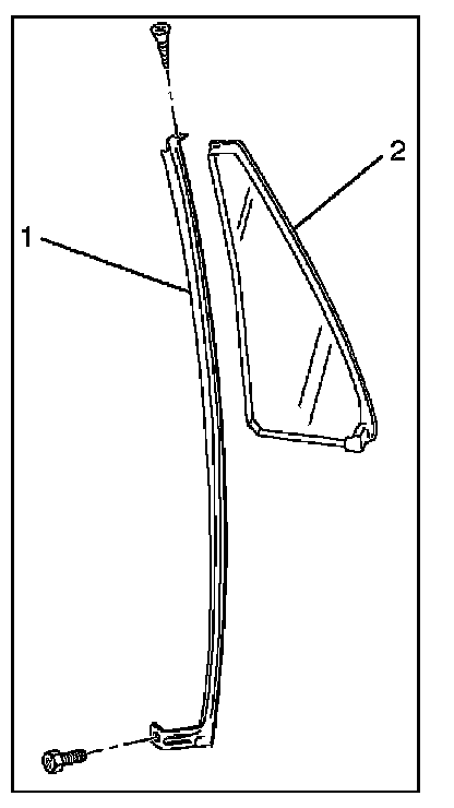 14. Remove the fixed window glass (2) by removing the screw from the top of the division bar (1) and the bolt from the bottom of the division bar.