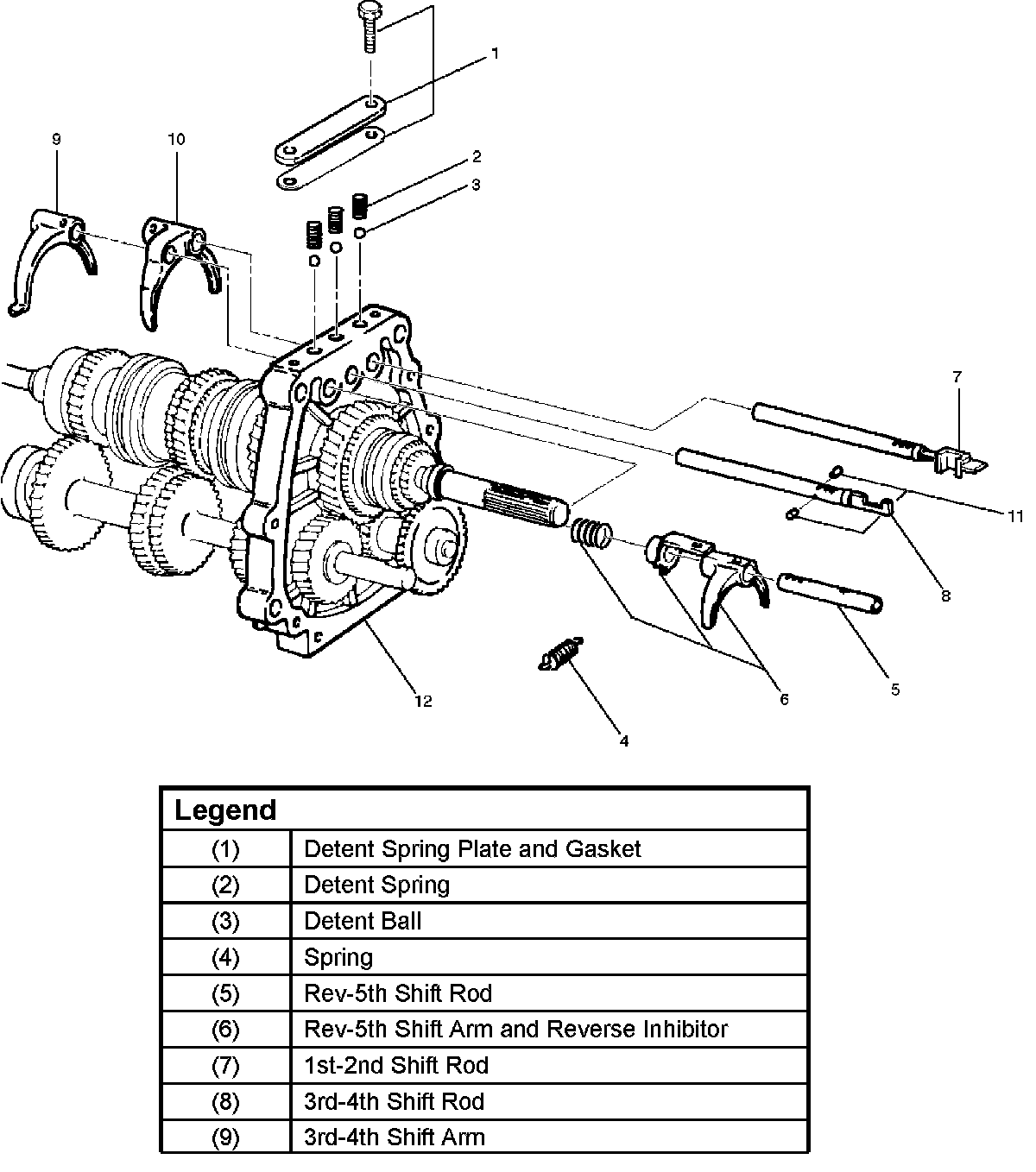 Remove 1st-2nd shift rod (7), 3rd-4th shift rod (8), 3rd-4th shift arm (9), and 1st-2nd shift arm (1 O).
