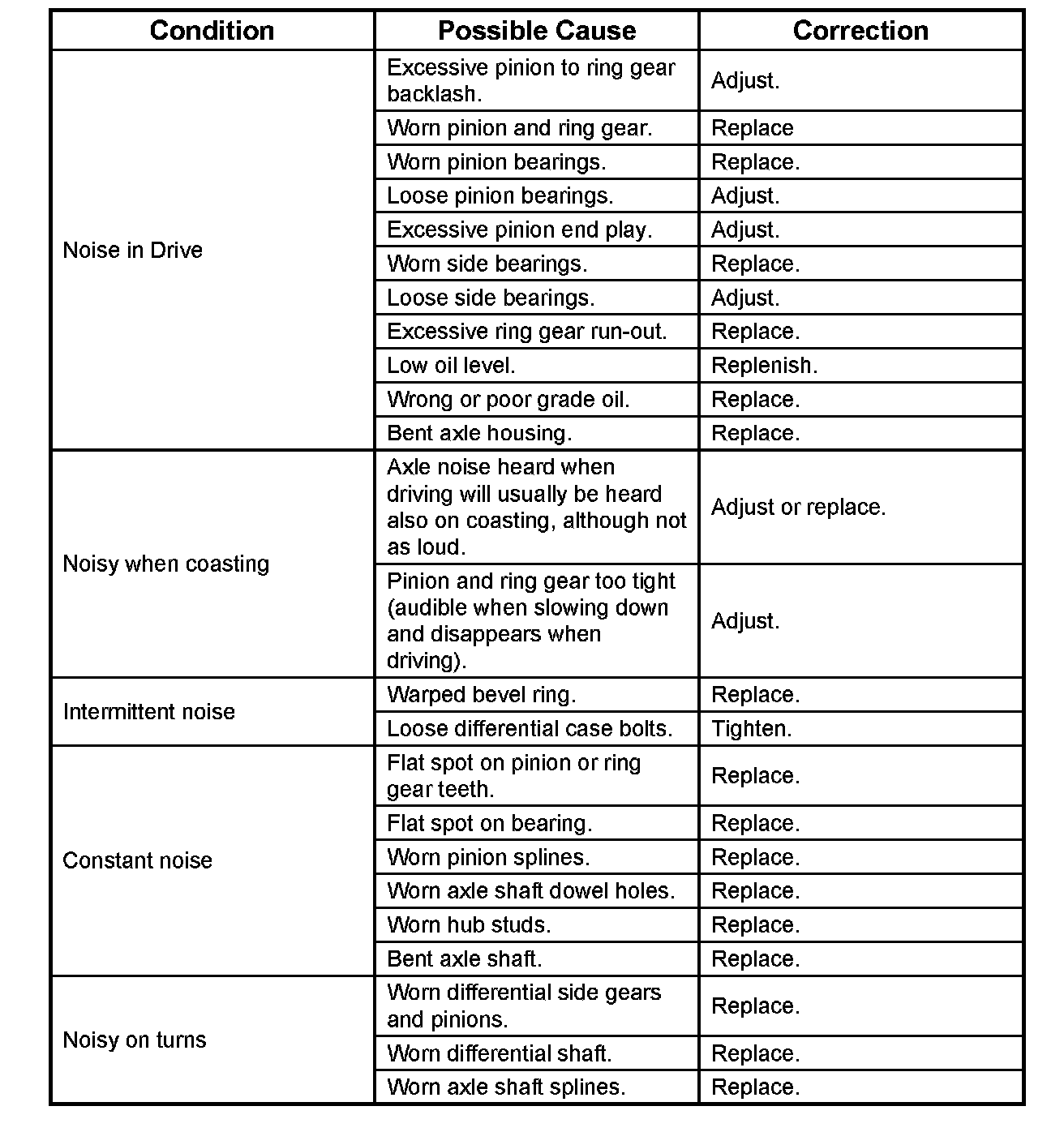 Many noises that seem to come from the rear axle actually originate from other sources such as tires, road surface, wheel bearings, engine, transmission, muffler, or body drumming. Investigate to find the source of the noise before disassembling the rear axle. Rear axles, like any other mechanical device, are not absolutely quiet but should be considered quiet unless some abnormal noise is present.