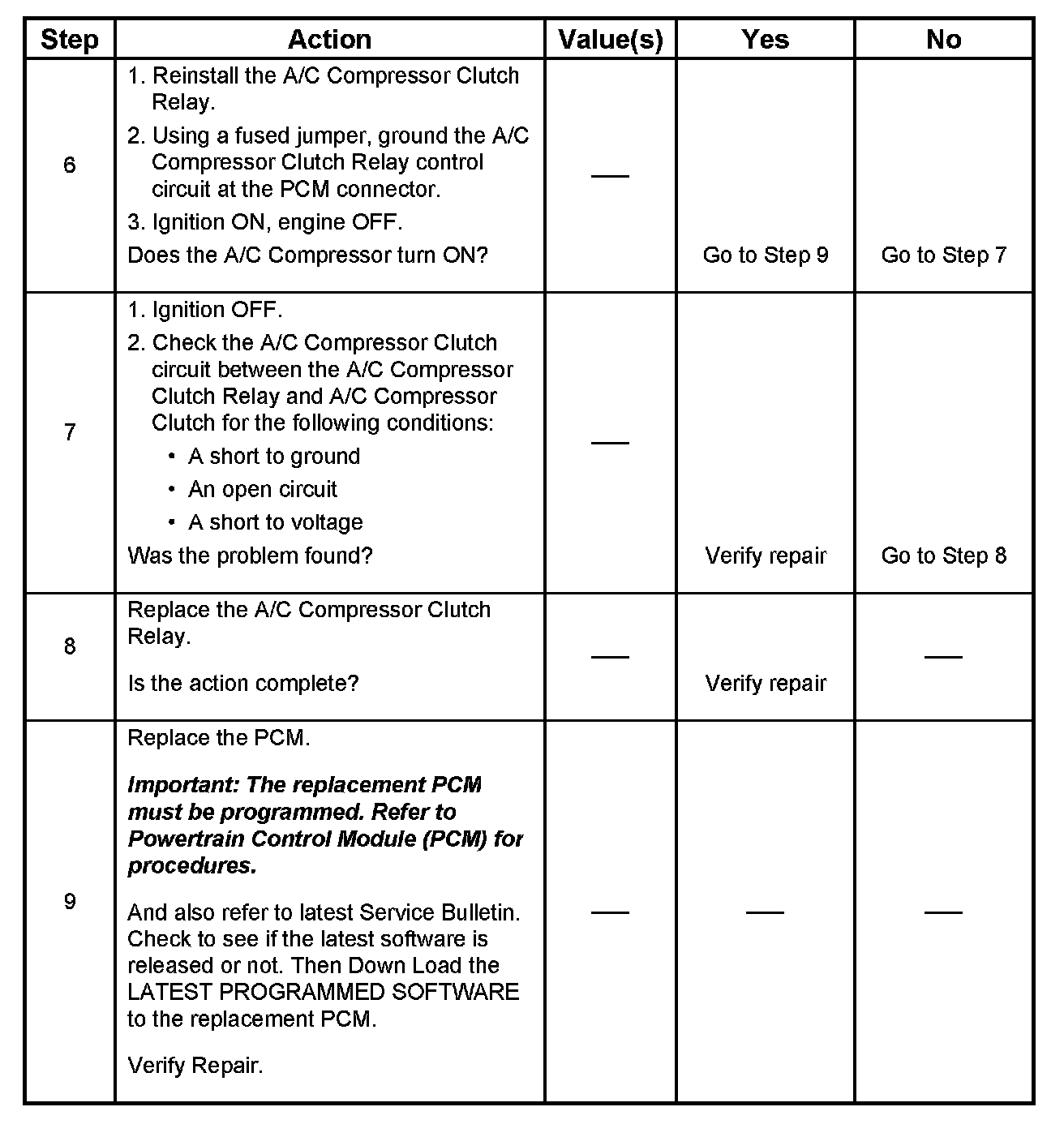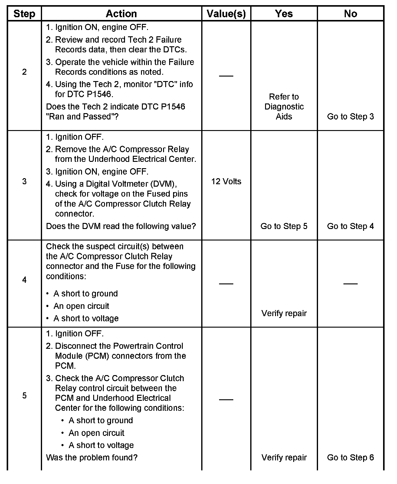 This chart should be used for diagnosing the electrical portion of the A/C compressor clutch circuit. A Tech 2 will be used in diagnosing the system. The Tech 2 has the ability to read the A/C request input to the PCM. The Tech 2 can display when the PCM has commended the A/C clutch ON. The Tech 2 should have the ability to override the A/C request signal and energize the A/C compressor relay.