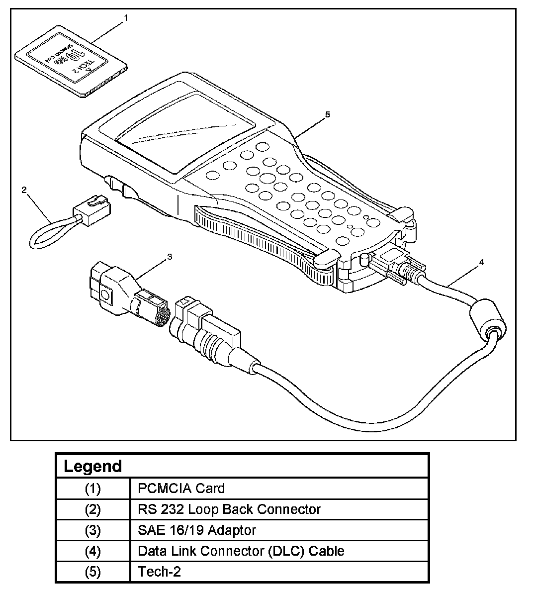 1. The Isuzu 2001MY System PCMCIA card (1) inserts into the Tech 2 (5).