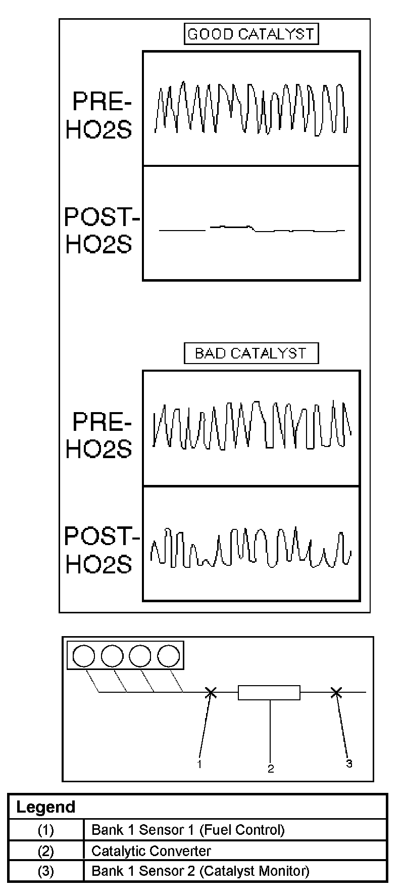 Three-way catalytic converters are used to control emissions of hydrocarbons (HC), carbon monoxide (CO), and oxides of nitrogen (NOx). The catalyst within the converters promotes a chemical reaction. This reaction oxidizes the HC and CO present in the exhaust gas and converts them into harmless water vapor and carbon dioxide. The catalyst also reduces NOx by converting it to nitrogen. The PCM can monitor this process using the Bank 1 HO2S 2 heated oxygen sensor. The Bank 1 HO2S 1 sensor produces an output signal which indicates the amount of oxygen present in the exhaust gas entering the three-way catalytic converter. The Bank 1 HO2S 2 sensor produces an output signal which indicates the oxygen storage capacity of the catalyst. This indicates the catalyst's ability to efficiently convert exhaust gases. If the catalyst is operating efficiently, the Bank 1 HO2S 1 signal will be more active than the signal produced by the Bank 1 HO2S 2 sensor.
