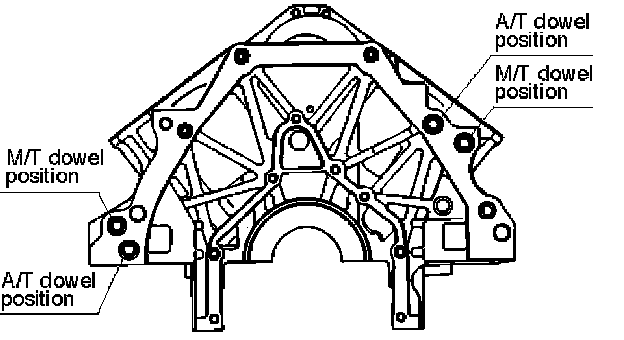 NOTE: Take care that dowel positions are different between the manual transmission and the automatic transmission.