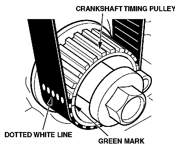 For correct belt stretch, the doffed line must meet the green mark on the crankshaft timing pulley at the 9 o'clock position. If there isn't enough slack to slip the belt over the pulley in the correct position, turn the crankshaft a few degrees counterclockwise, install the belt, then turn the crankshaft back to the 9 o'clock position.