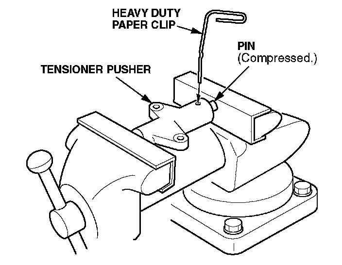 5. Place the tensioner pusher in a soft-jawed vise, then slowly compress the tensioner pusher pin until it lines up with the two small holes in the tensioner pusher housing.