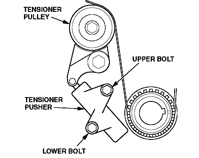 - Push the tensioner pusher up against the tensioner pulley, then install the upper bolt, and torque it to 25 N.m (15 lb-ft).