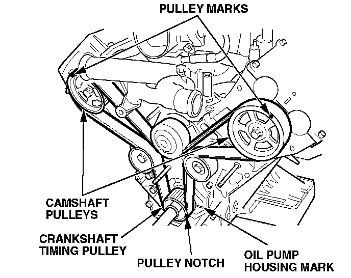 - Align the crankshaft timing pulley notch with the mark on the oil pump housing.