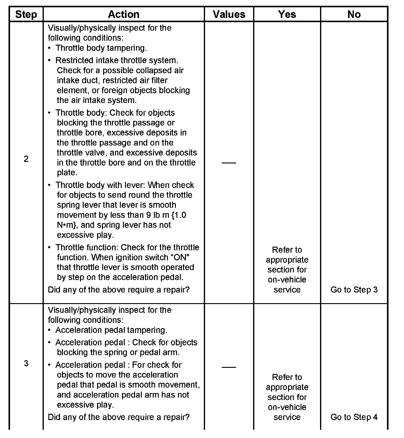 3. Visually/physically inspect for the following acceleration pedal conditions.