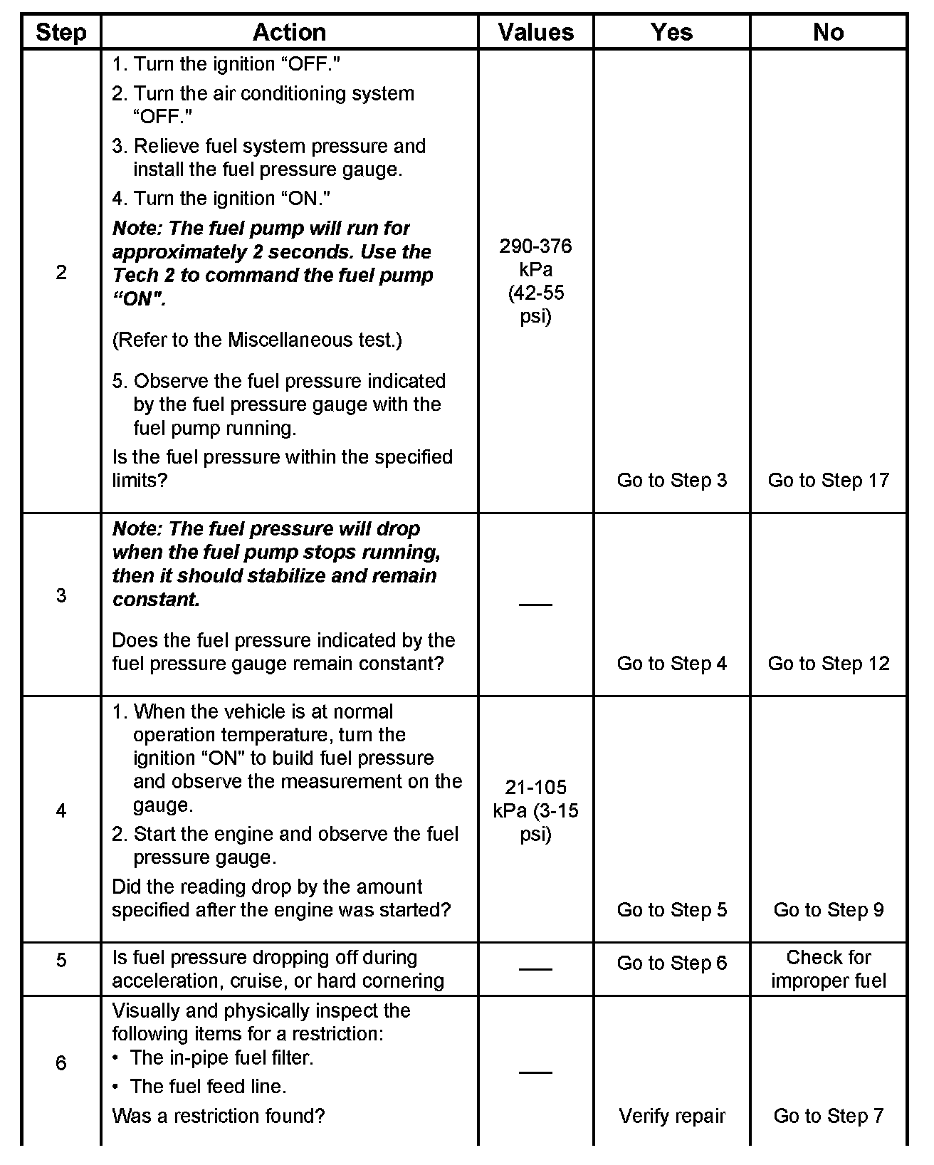 4. Fuel pressure that drops off during acceleration, cruise, or hard cornering may case a lean condition. A lean condition can cause a loss of power, surging, or misfire. A lean condition can be diagnosed using a Tech 2. If an extremely lean condition occurs, the oxygen sensor(s) will stop toggling. The oxygen sensor output voltage(s) will drop below 500 mV. Also, the fuel injector pulse width will increase.
