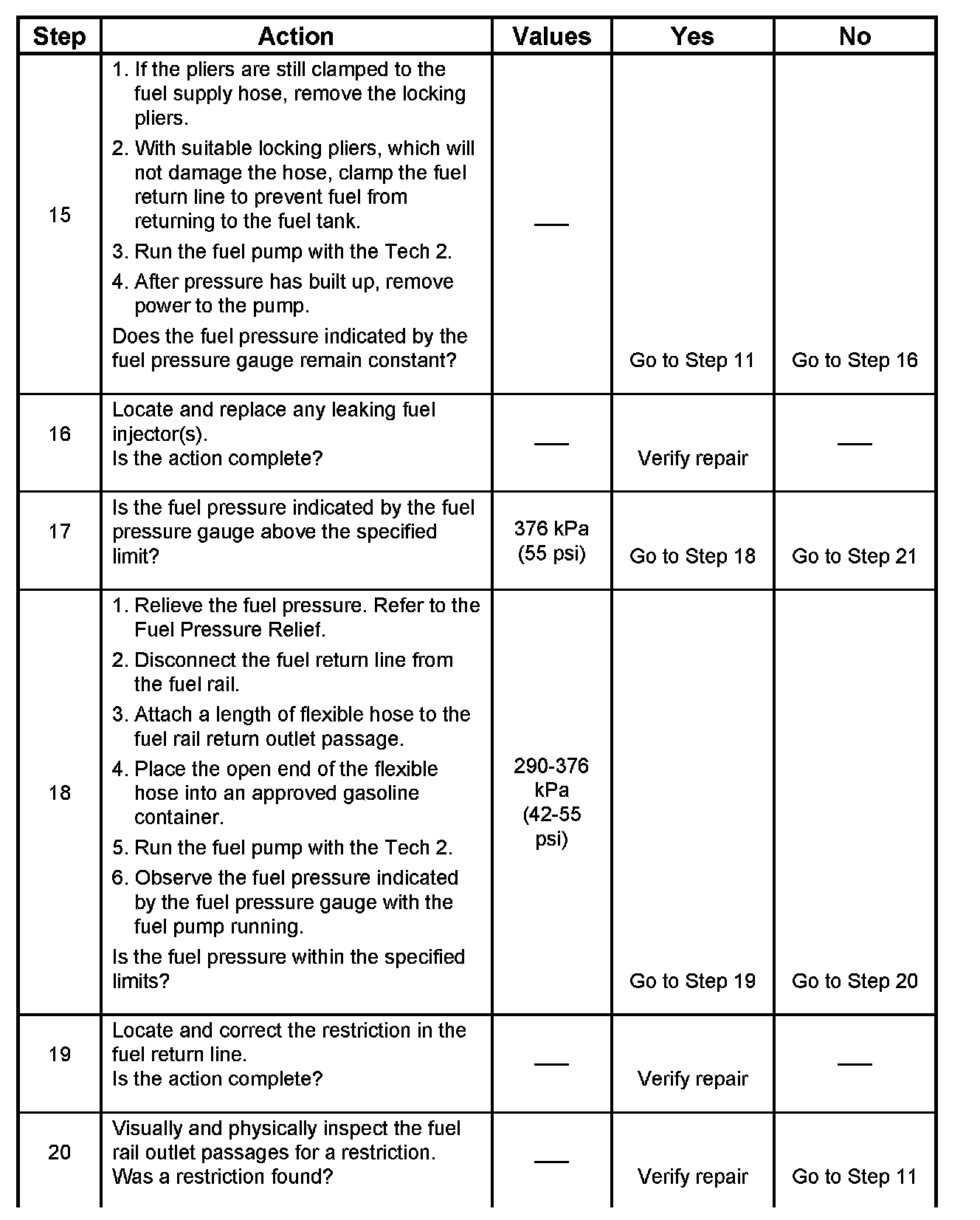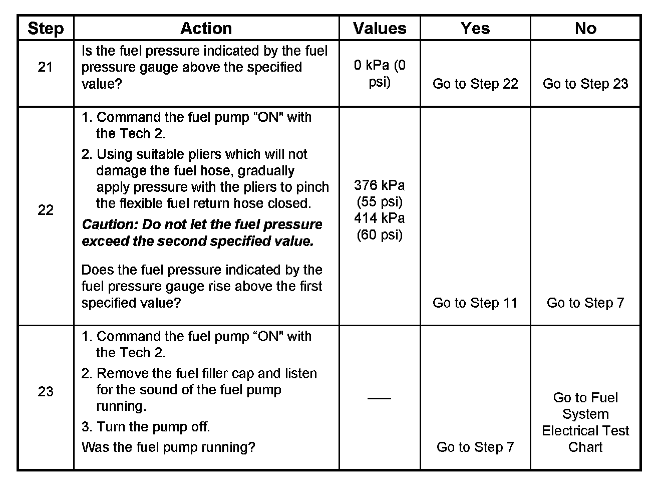 22. Restricting the fuel return line causes the fuel pressure to rise above the regulated fuel pressure. Command the fuel pump "ON" with the Tech 2. The fuel pressure should rise above 376 kPa (55 psi) as the fuel return line becomes partially closed.
