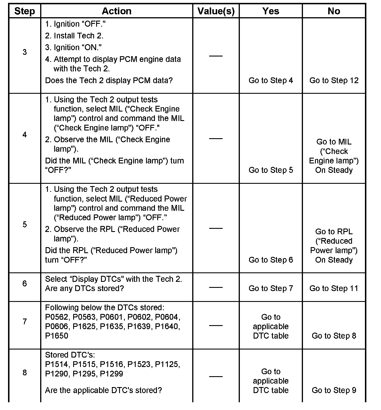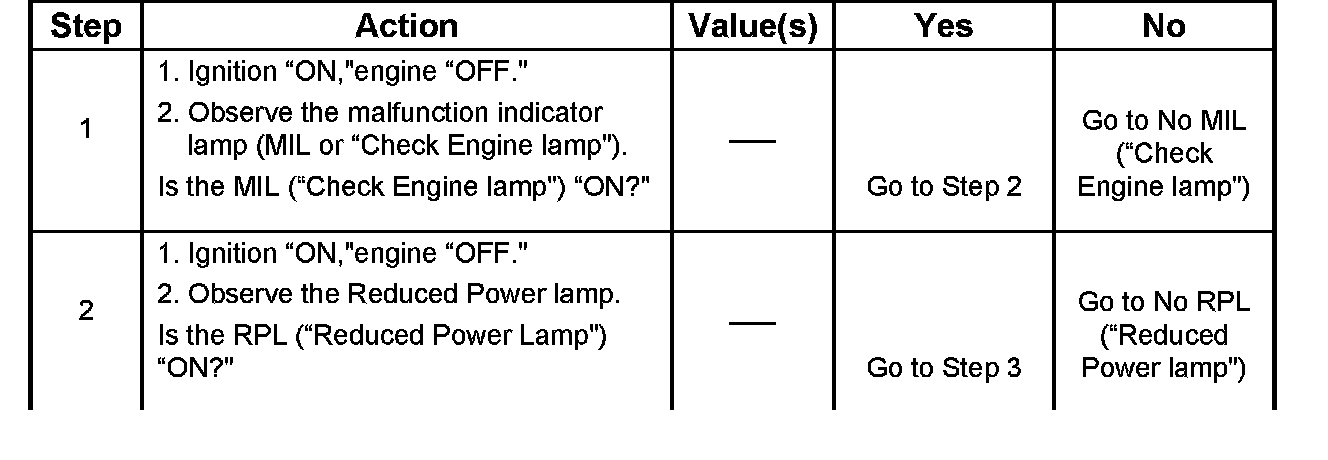 1. The MIL ("Check Engine lamp") should be "ON" steady with the ignition "ON "engine "OFF." If not, the "No MIL" chart should be used to isolate the malfunction.