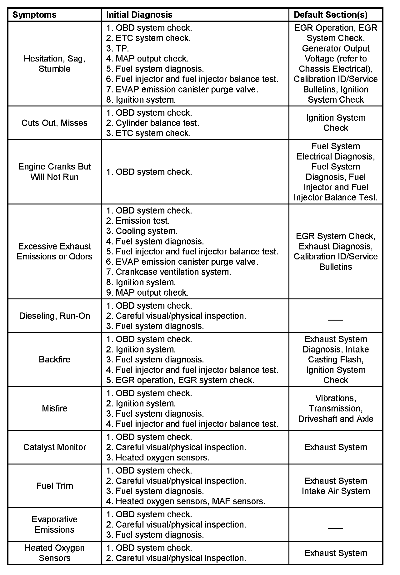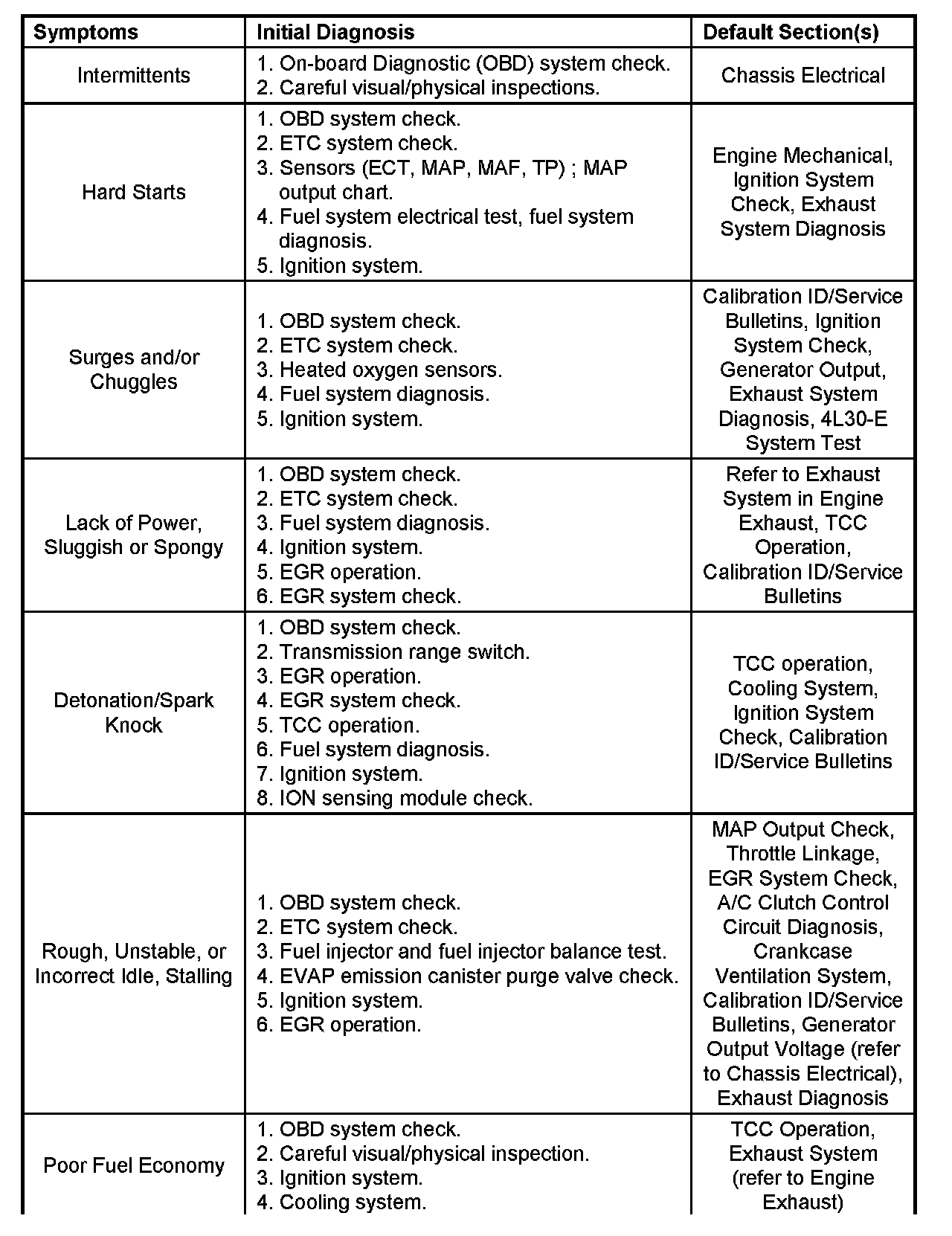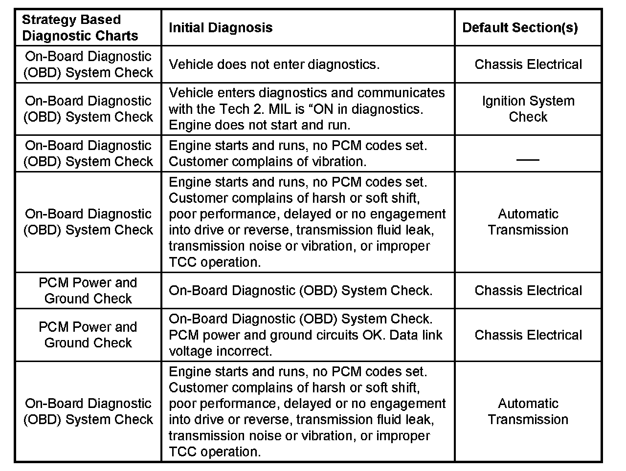 Service Procedure Default StrategyA referral strategy has been established to assist the technician with additional information when the cause of the failure cannot be determined. If no problem is found after performing diagnostics, then refer to the default matrix table for further diagnostic information.
