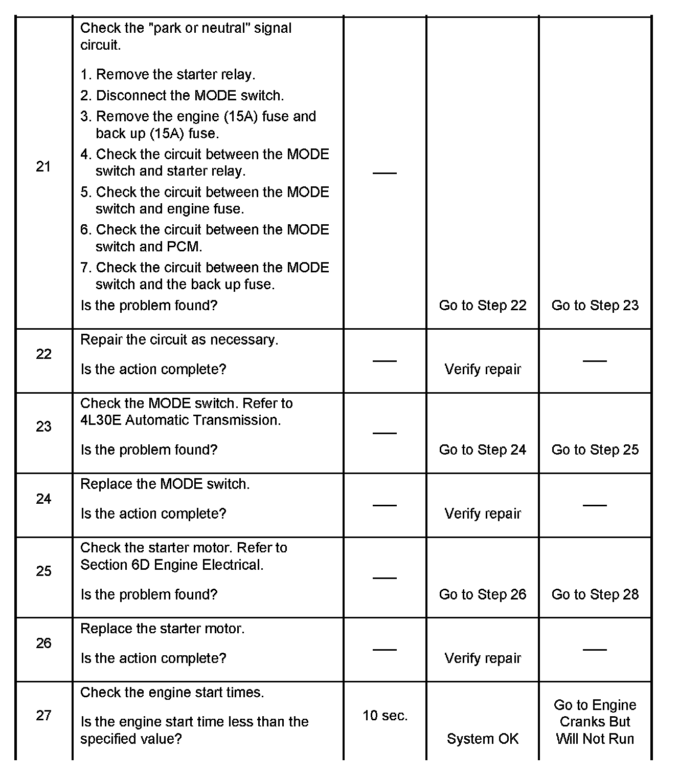 The starter control system is controlled by the Power Train Control Module (PCM). The PCM monitors the starter switch signal ("START" position) and MODE switch (park or neutral) signal. The PCM is operated by the ignition switch. Ignition feed voltage is supplied to the MODE switch and starter relay through the engine fuse. The PCM turns the starter relay through the engine fuse. The PCM turns the starter relay "ON" by grounding the starter relay driver circuit.