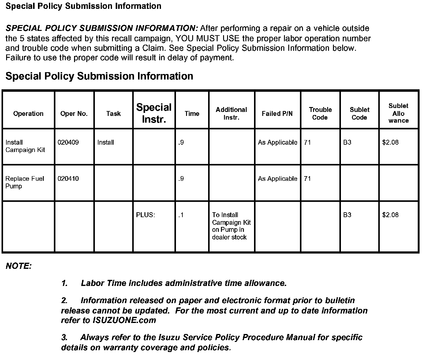 All fuel pump assemblies replaced must be returned to Isuzu Motors America, Inc. through the warranty parts return program using the appropriate shipping methods.