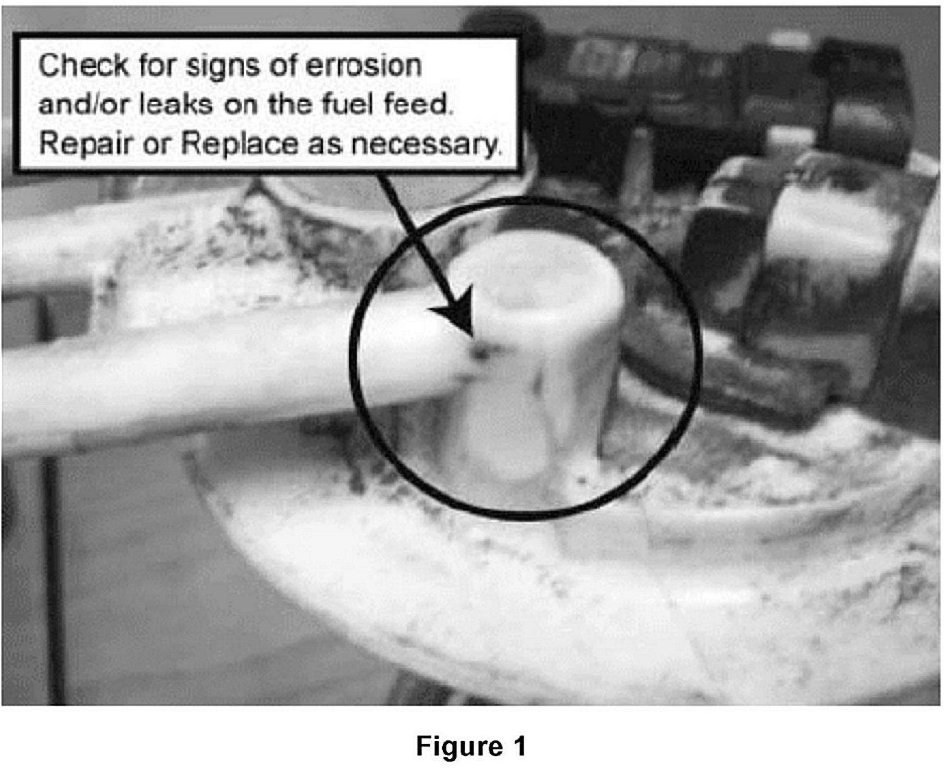 1. Inspect the fuel pump feed port for signs of fuel leakage or electrostatic discharge mark(s) as shown in figure 1.