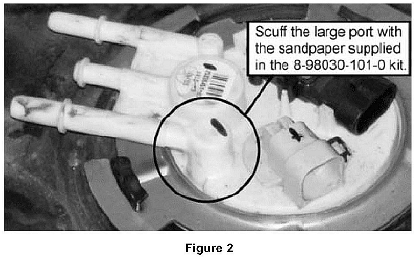 1. Using the sandpaper supplied in Campaign Service Kit 8-98030-101-0, scuff the fuel pump feed port as shown in figure 2 as well as the inside portion of the two plastic halves contained in the Campaign Kit. After scuffing, prep the port and plastic halves thoroughly by using Isopropyl alcohol to clean and remove any oils, grease, and other contaminants.