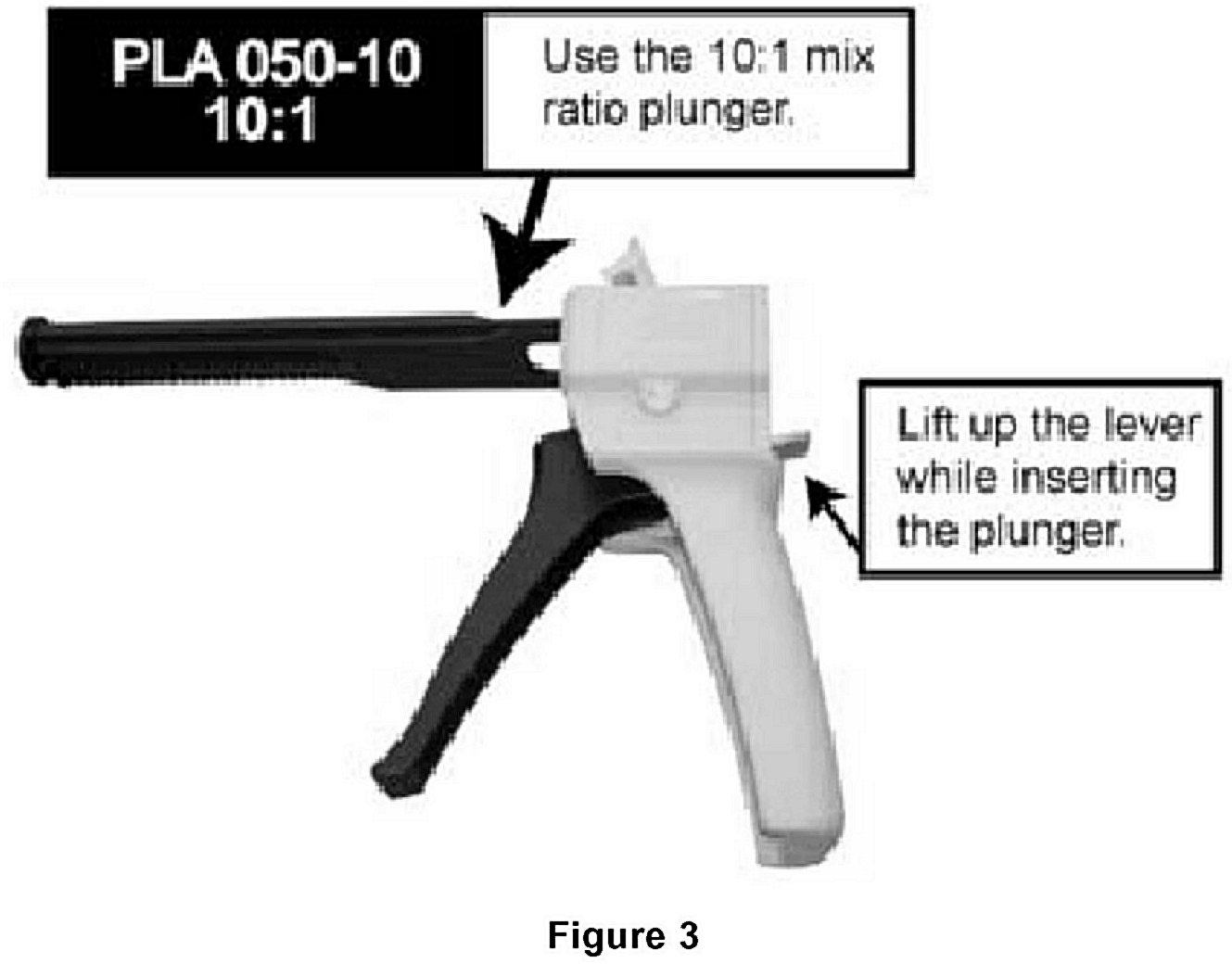 2. Assemble applicator by first installing the 10:1 mix ratio plunger assembly as shown in figure 3. Lift up the lever on the back handle and insert the plunger.