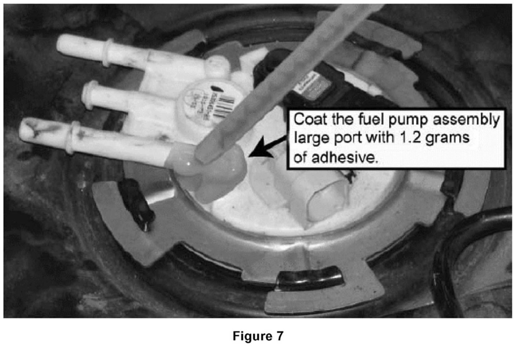 7. Apply 1.2 grams of adhesive liberally to completely cover the Fuel Pump Feed Port of the fuel pump assembly as shown in figure 7.