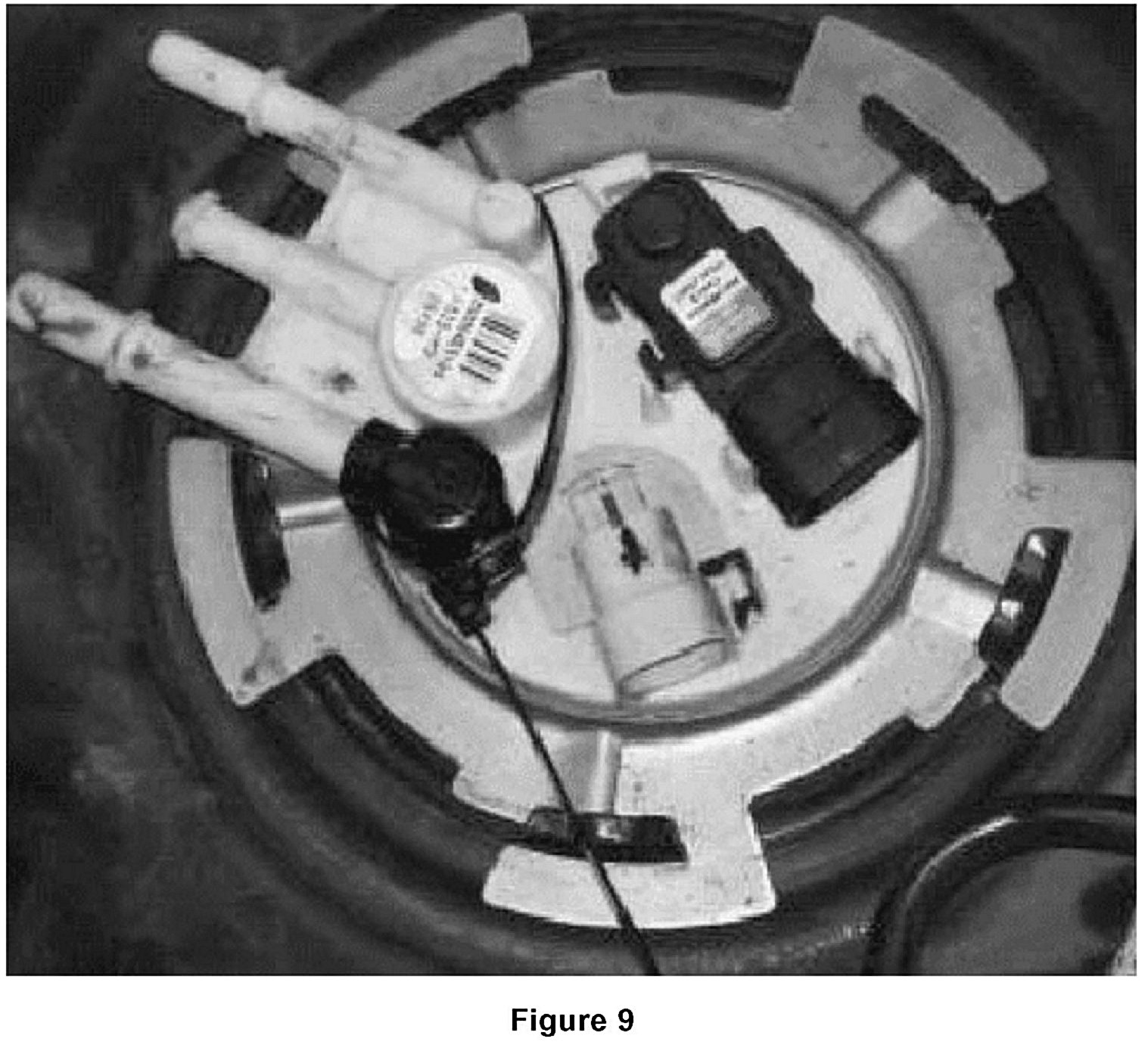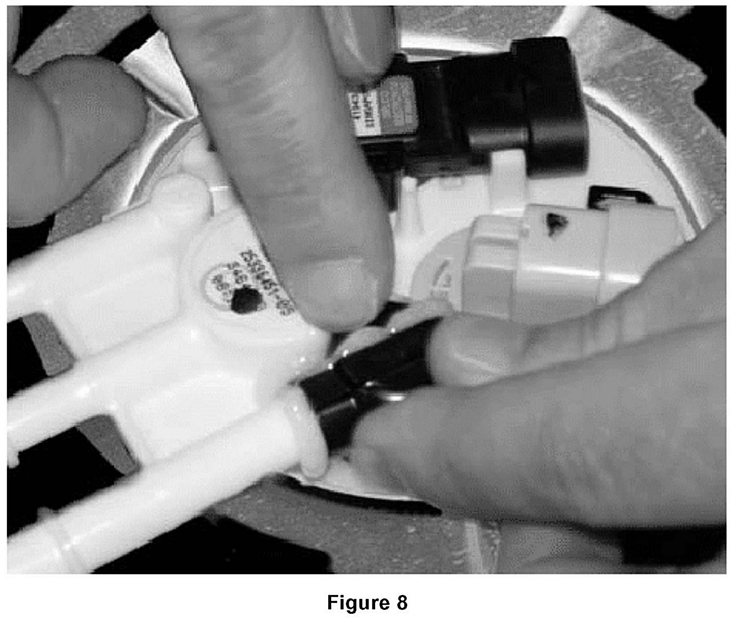 9. Press the two plastic pieces together and use the tie strap supplied to add support. The strap goes underneath and around the fuel pump assembly as shown in figure 9. Hand tighten the tie strap.