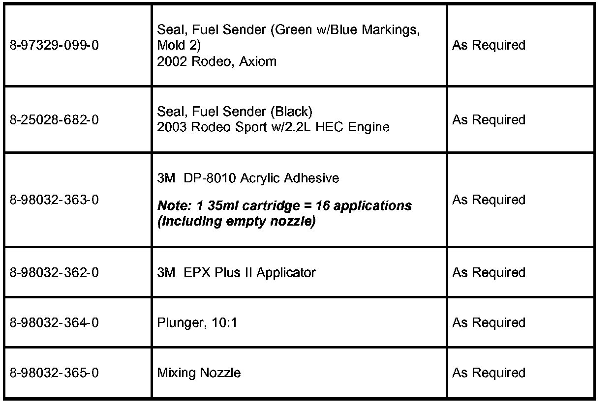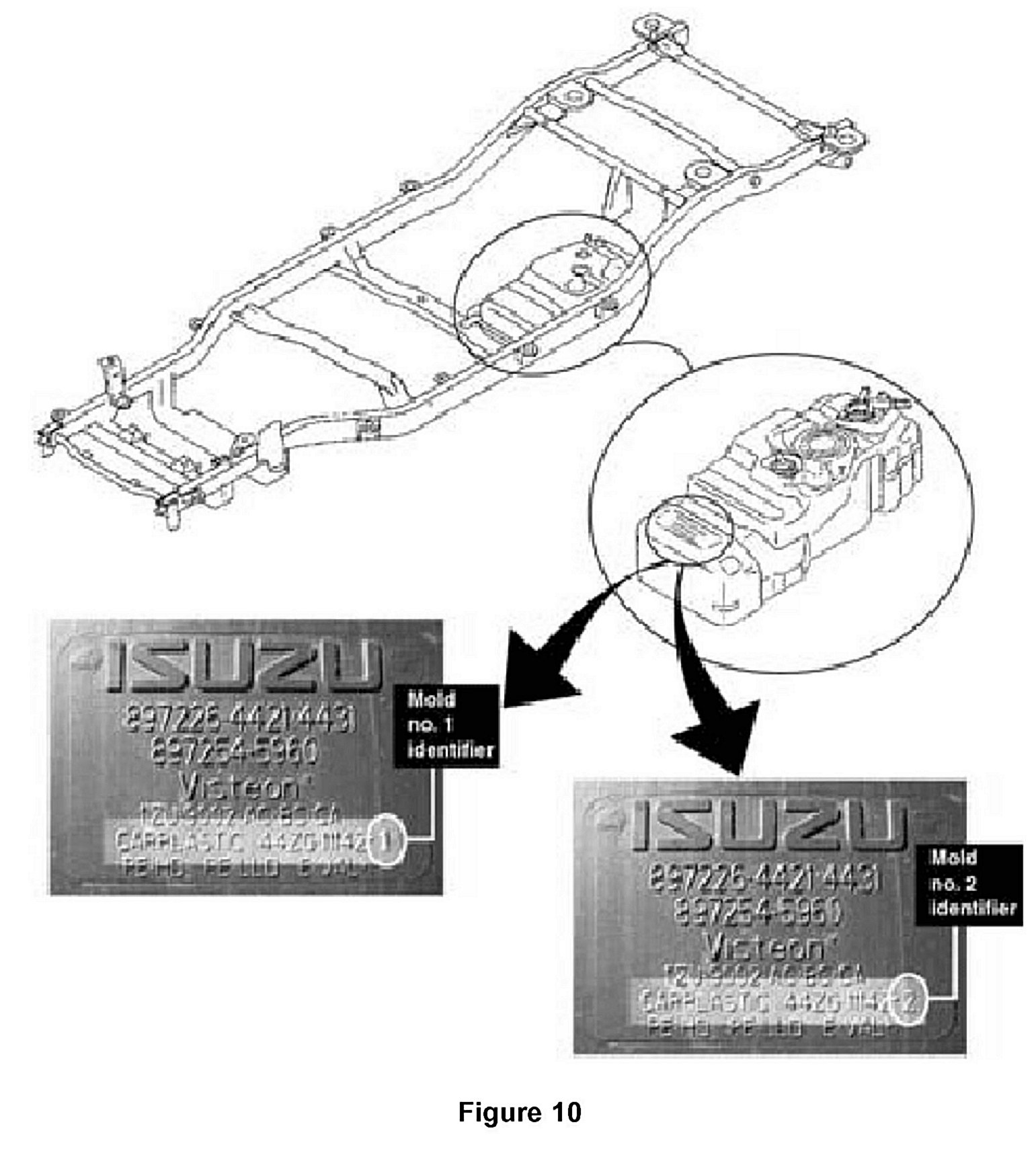 1. 2002 Rodeos and Axioms were built with one of two possible fuel tank molds. Verify the fuel tank casting number (Mold 1 or Mold 2). Select the appropriate seal for the fuel tank mold of each vehicle in figure 10 (see Parts Information for selection).
