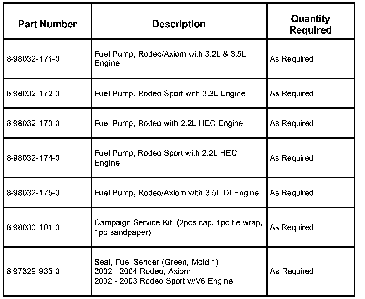 If a new fuel pump assembly is required check dealer stock and perform the Fuel Pump Repair Procedure on in-stock assembly before installation in the vehicle. If no dealer stock is available, refer to the Parts Information below and order the fuel pump assembly through AIPDN. All future fuel pump assembly replacements in affected vehicles must have the Campaign Service Kit # 8-98030-101-0 installed.