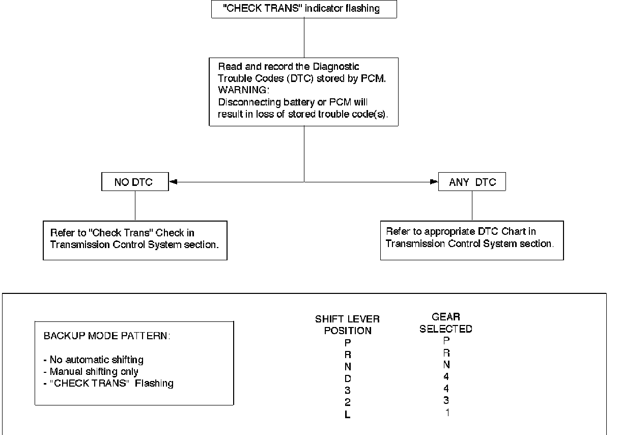 Perform Preliminary Inspection First!When the "CHECK TRANS" indicator is flashing, it indicates that a problem related to the transmission, the Powertrain Control Module (PCM), or the vehicle harness has occurred.