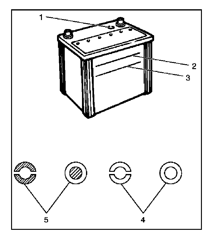 The fluid level should be between the upper level line (2) and lower level line (3) on side of battery.