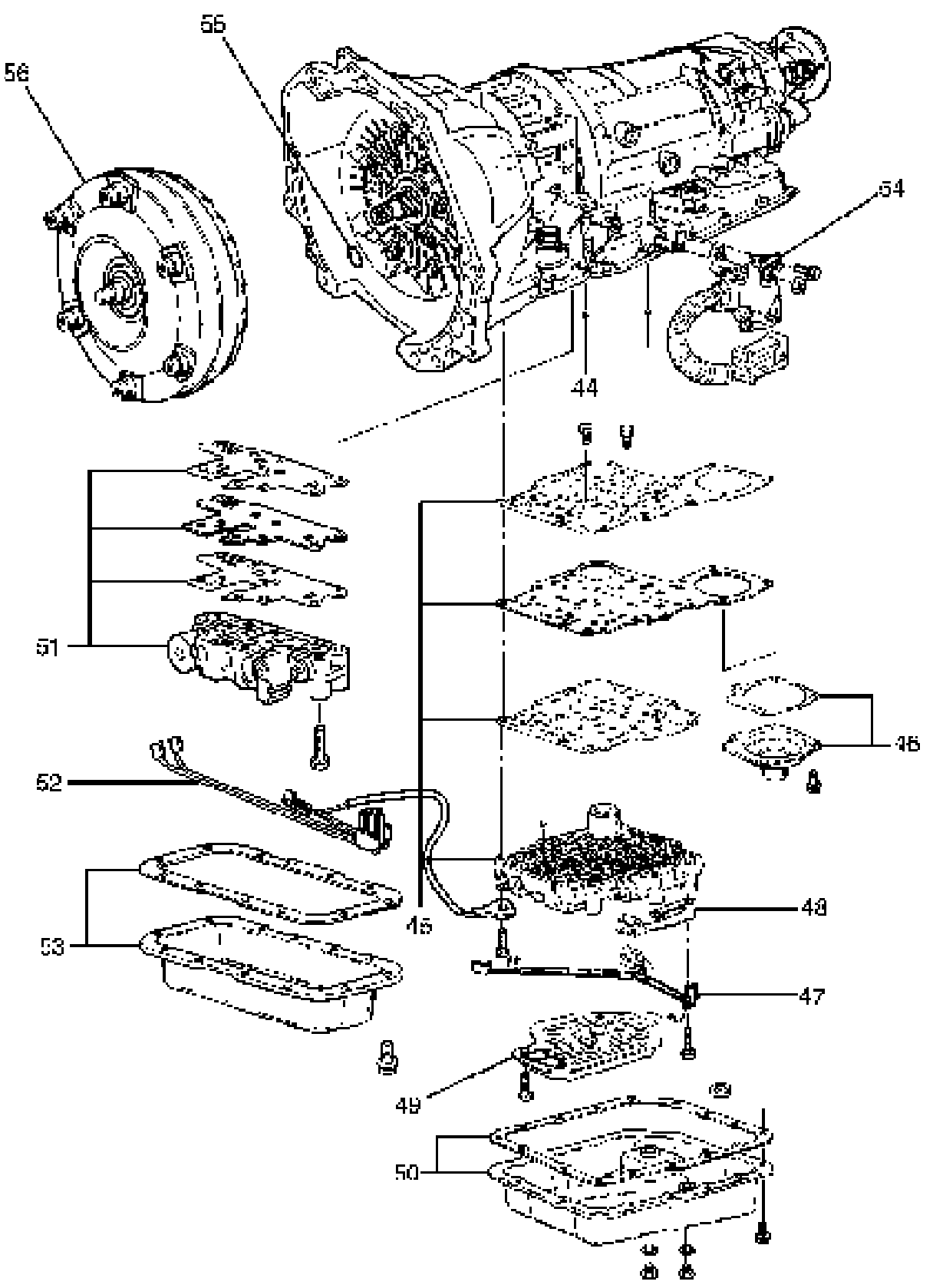 56. Connect wiring harness harness assembly (52) to converter clutch solenoid, force motor, and 4 way (V6) or 5 way (HEC) connector.