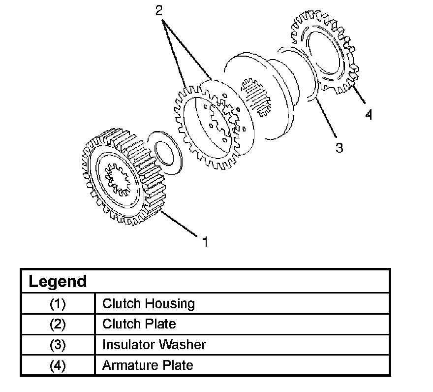 - If the burned, mirror-surfaced clutch facing, or scraping is observed on the clutch plates, clutch housing, armature plate, and insulator washer, replace the parts.