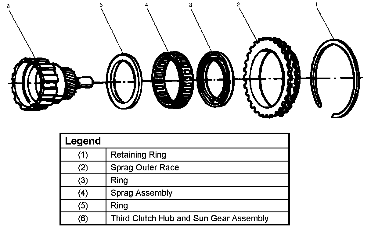 1. Remove the sprag outer race, retaining ring, and sprag assembly from the third clutch hub and sun gear assembly.