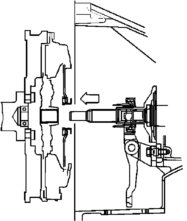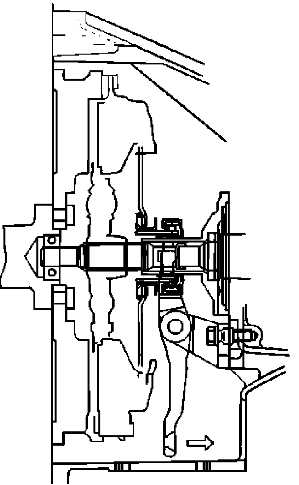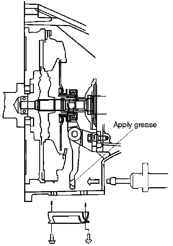 5. Apply a force of about 113 N (26 lb.) to the tip of the shift fork in the direction of the transmission to engage the clutch pressure plate and release bearing.