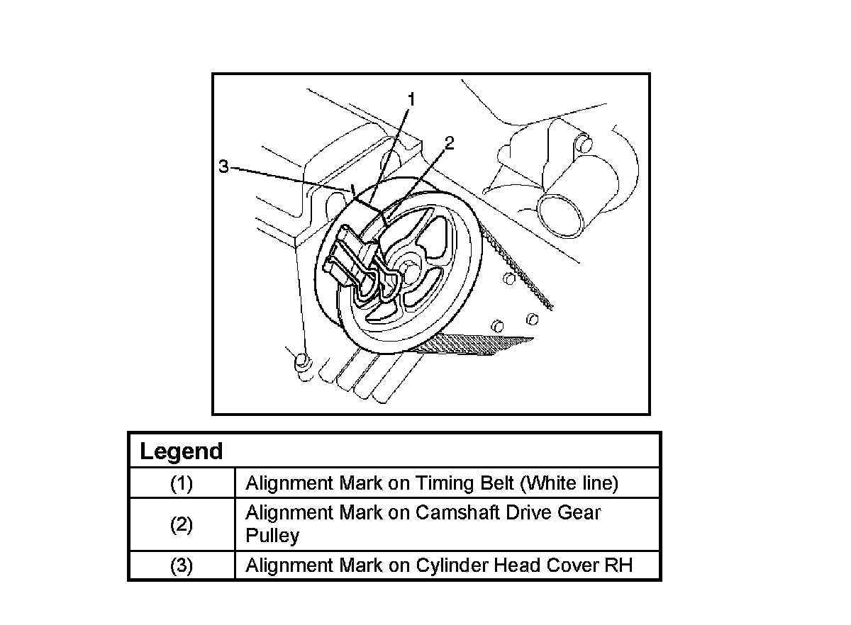 5. Align the alignment mark (white line) on the timing belt (1) with the alignment mark on the LH bank camshaft drive gear pulley (2).