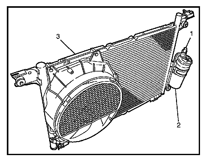 The condenser assembly (3) is located in front of the radiator. It provides rapid heat transfer from the refrigerant to the cooling fins.