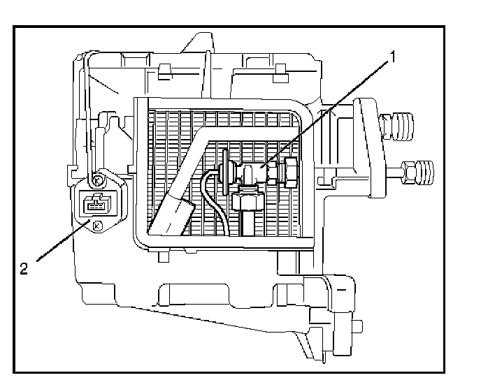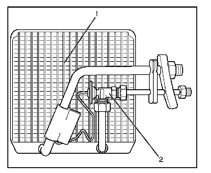 The evaporator cools and dehumidifies the air before the air enters the passenger compartment. High-pressure liquid refrigerant flows through the expansion valve (2) into the low-pressure area of the evaporator. The heat in the air passing through the evaporator core (1) is lost to the cooler surface of the core, thereby cooling the air.