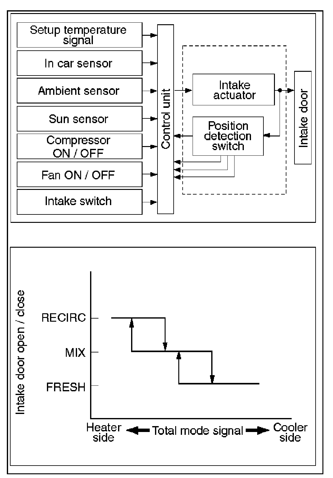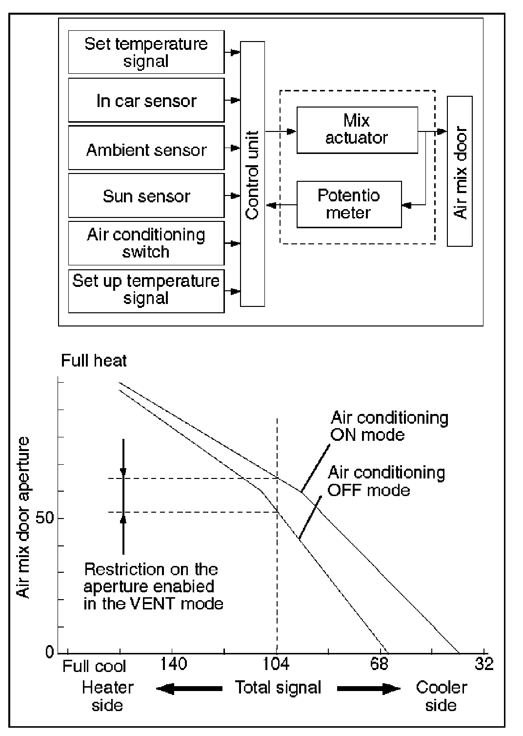 The automatic heater/air conditioner control unit operates on the setup temperature signal from the temperature control switch and other sensor signals to derive the total signal. Then, the control unit compares this signal against the signal from the potentiometer to determine rotation direction of the mix actuator. The mix actuator moves the air mix door to the aperture specified by the total signal so that the specified interior temperature is achieved.