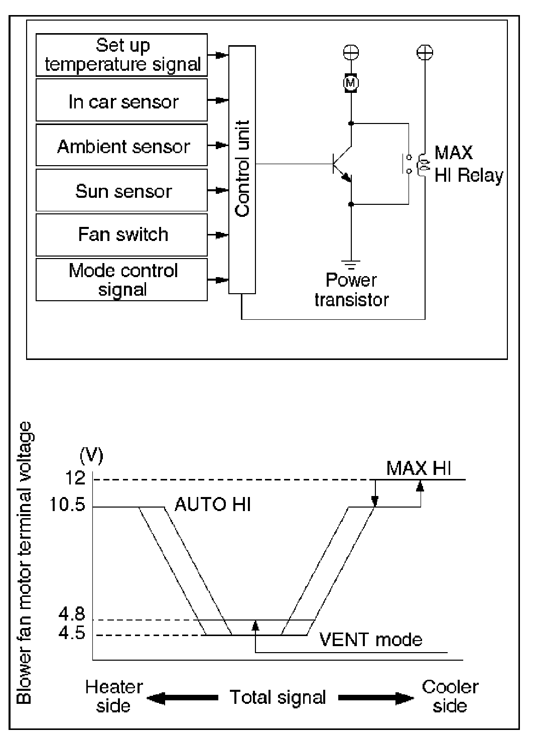 The automatic heater/air conditioner control unit operates on the setup temperature signal and other sensor signals to derive the total signal. Then, the control unit adjusts base potential of the power transistor to match it to the voltage pattern of the target fan so that stage-less fan speed control can be achieved.When solar radiation quantity is detected in the VENT or B/L mode, the control unit increases the minimum fan voltage to offset. When FH or FC is selected from the temperature control switch, air flow is accordingly fixed to MAX HI or AUTO HI.