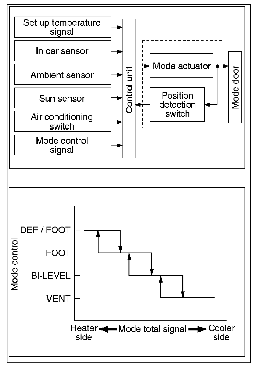The automatic air conditioner control unit operates on the setup temperature from the control switch, and temperature and solar radiation quantify from the sensors to determine the total mode control signal. According to the pattern specified by this signal, the control unit selects either one of the VENT, BI-LEVEL, FOOT or DEF/FOOT mode.