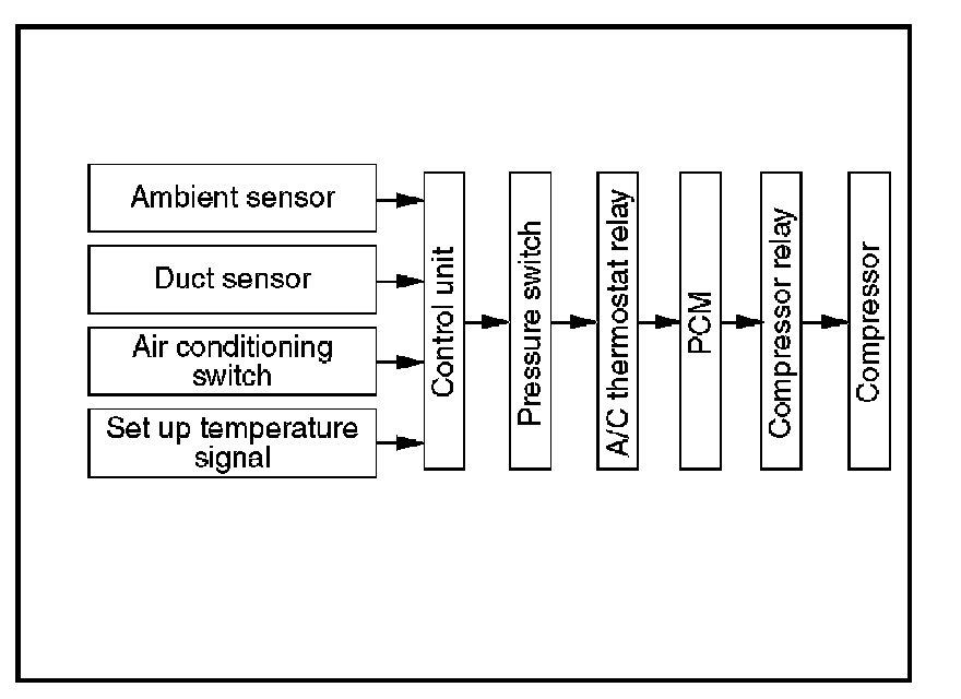 In the Full Auto mode, the automatic air conditioner control unit operates on the setup temperature signal and other sensor input signals to derive the total signal. According to the pattern specified by this signal, the control unit provides the intake control.