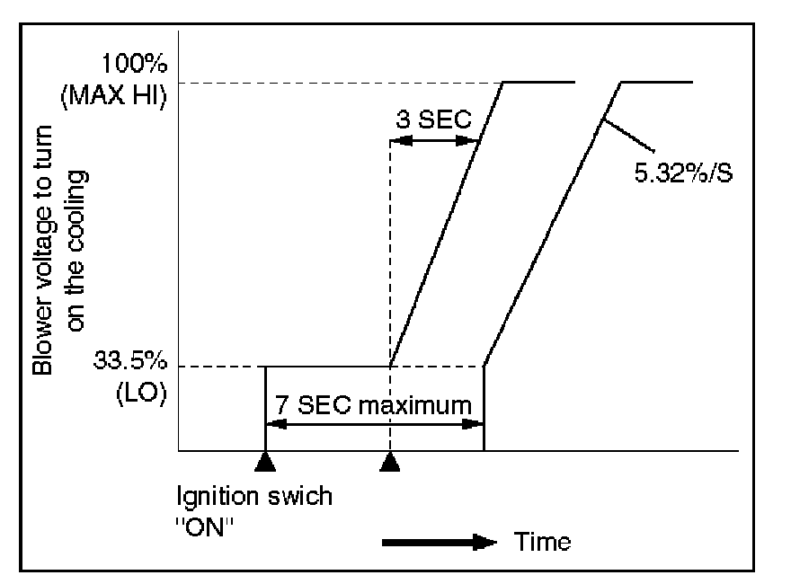 The blower fan speed is set to "LO" for maximum 7 seconds when cooling start conditions meet, and then, is controlled to be lineally up to "MAX HI" by 5.32%/S.
